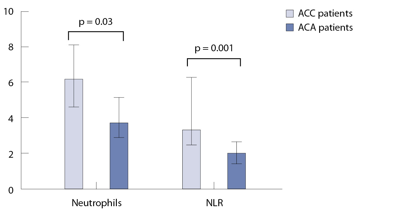 Значения НЛИ и количество нейтрофилов были выше у больных АКР по сравнению с пациентами с АКА (рис. 1). У обследованных с АКР и СК величина НЛИ была выше по сравнению с больными АКА без СК и наблюдалась тенденция к большей величине НЛИ по сравнению с больными АКР без СК и АКА с СК. НЛИ был выше у больных АКР без СК и у пациентов с АКА с СК в отличие от обследованных с АКА без СК (см. табл. 1).