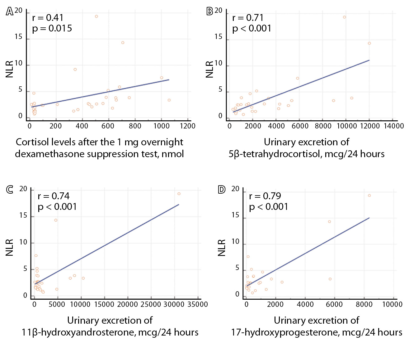 В литературе есть данные о связи выраженности изменений показателей клинического анализа крови со степенью тяжести гиперкортизолизма [4]. Разработаны индексы, характеризующие системное воспаление у больных с солидными опухолями различной локализации. Среди наиболее обсуждаемых показатель отношения нейтрофилов к лимфоцитам крови – нейтрофильно-лимфоцитарный индекс (НЛИ), суррогатный маркер активации клеточного иммунитета, применяющийся для оценки иммунного ответа [4–7]. Установлены более высокие значения НЛИ у больных СК по сравнению с практически здоровыми лицами [8], а также с больными адренокортикальной аденомой (АКА) без гормональной активности клеток опухоли, определенной традиционными лабораторными методами [9]. В работе M. Detomas и соавт. значения НЛИ у больных АКР с гиперкортизолизмом и кортикотропин-эктопическим синдромом были выше в отличие от обследованных с кортикотропиномами и кортикостеромами [7]. V. Favero и соавт. показали зависимость величины НЛИ от уровня кортизола крови после ночного подавляющего теста с 1 мг дексаметазона (ПДТ1) и на этом основании сделали вывод о влиянии гиперкортизолизма на уровень системного воспаления у больных с доброкачественными объемными образованиями надпочечников [4].