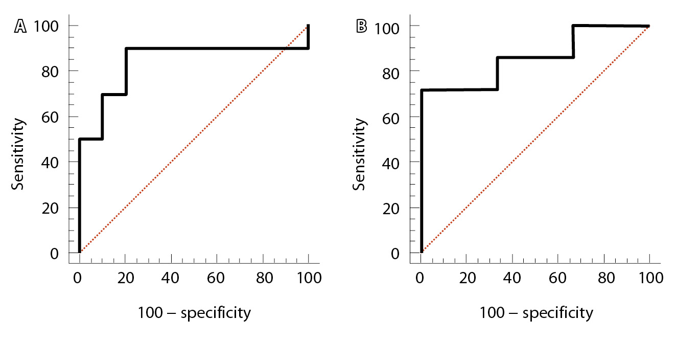 Рис. 3. Чувствительность и специфичность нейтрофильно-лимфоцитарного индекса для определения злокачественного потенциала объемного образования надпочечника в дооперационном периоде у больных с синдромом Кушинга (А; чувствительность 90%, специфичность 80%, критерий > 2,72, AUC = 0,840, p = 0,001) и без гиперкортизолизма (Б; чувствительность 71,4%, специфичность 100%, критерий > 1,92, AUC = 0,857, p = 0,001); AUC – площадь под кривой (англ. area under the curve)