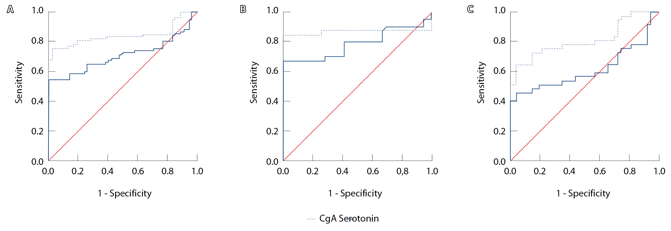 Согласно результатам ROC-анализа, при ожирении или избыточной массе тела диагностическая эффективность ХгА и серотонина у больных НЭО относительно контрольной группы ниже, чем у больных с нормальной массой тела (рисунок). Площадь под кривой (англ. area under curve, AUC) для ХгА при нормальной массе тела составила 0,87, а в подгруппе с ИМТ ≥ 25 – 0,81. В то же время для серотонина разница в AUC была еще более выраженной (0,78 при нормальной массе тела и 0,62 в подгруппе с ИМТ ≥ 25). Пороговые уровни были рассчитаны с учетом достижения максимального индекса Юдена, при этом в подгруппах они отличались. В общей группе НЭО при рассчитанном пороговом уровне ХгА 101 нг/мл (Jmax = 0,727) диагностическая чувствительность составила 75,3% при специфичности 97,4%. При анализе выборки с нормальной массой тела пороговый уровень ХгА 94,8 нг/мл (Jmax = 0,85) позволял достигать чувствительности 85% при практически 100% специ- фичности, тогда как у больных с ожирением или избыточной массой тела при пороговом уровне 102 нг/мл (Jmax = 0,606) диагностическая чувствительность равнялась 64,9% при специфичности 95,7%. Проведенный в общей группе больных НЭО анализ показал, что при рассчитанном пороговом уровне серотонина, равном 223 нг/мл (Jmax = 0,443), диагностическая чувствительность маркера была 58,4% при специфичности 85,9%. В подгруппе с нормальной массой тела пороговый уровень серотонина, рассчитанный по данным ROC-анализа, был выше 320 нг/мл (Jmax = 0,644, диагностическая чувствительность – 67,5%, специфичность – 96,9%); при ИМТ ≥ 25 он составлял 223 нг/мл (Jmax = 0,416, диагностическая чувствительность – 45,9%, специфичность – 95,7%), что соответствует описанным нами ранее статистически значимым различиям в уровнях серотонина в зависимости от массы тела не только у больных НЭО, но и в контрольной группе.
