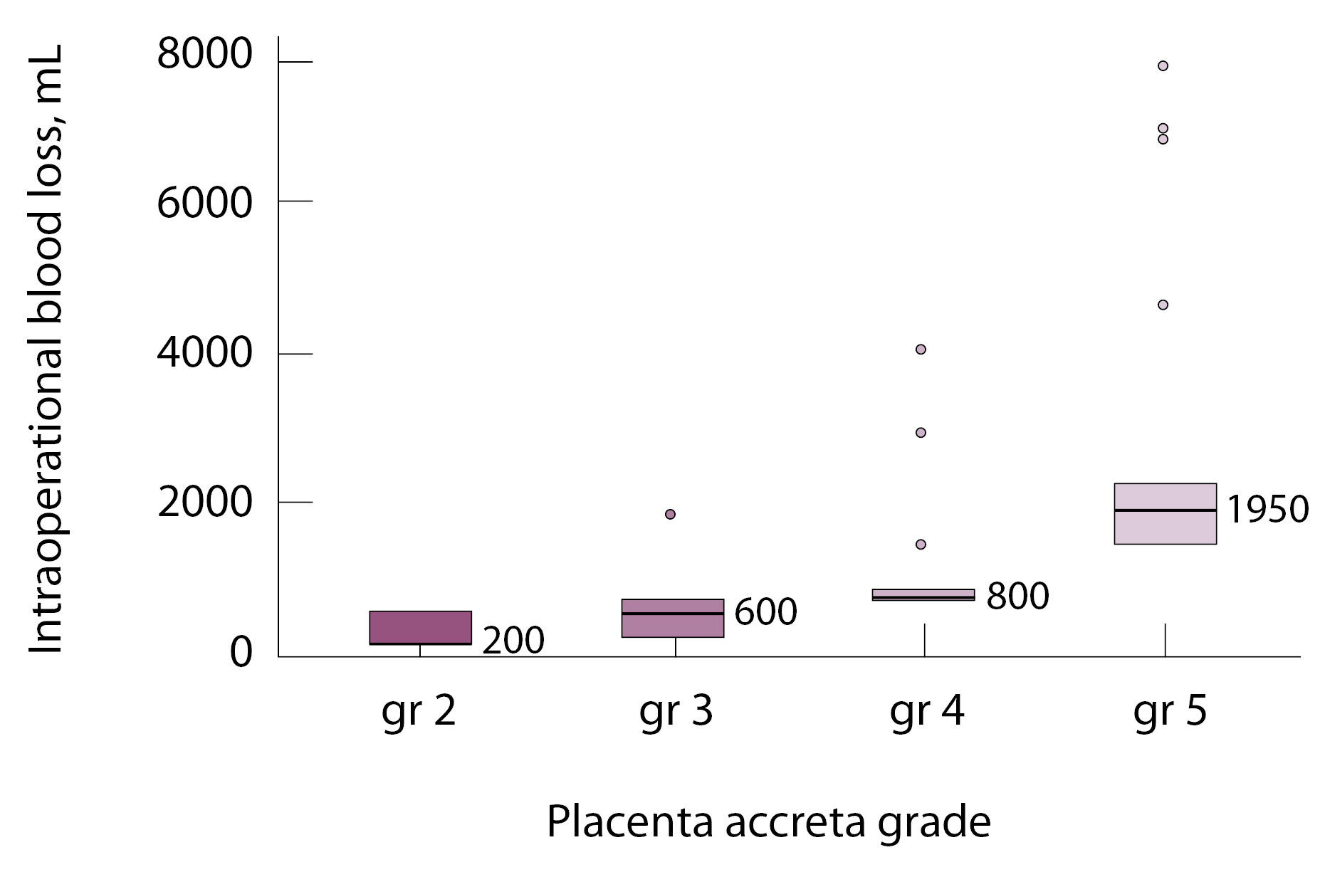 Рис. 1. Объем интраоперационной кровопотери в зависимости от степени приращения плаценты в соответствии с grade МАPI-RADS; p < 0,001 (критерий Краскела – Уоллиса); значения р для апостериорных попарных сравнений (критерий Данна с поправкой Холма): pgr 2 – gr 4 = 0,003, pgr 2 – gr 5 < 0,001, pgr 3 – gr 4 = 0,018, pgr 3 – gr 4 < 0,001, pgr 4 – gr 5 = 0,016
