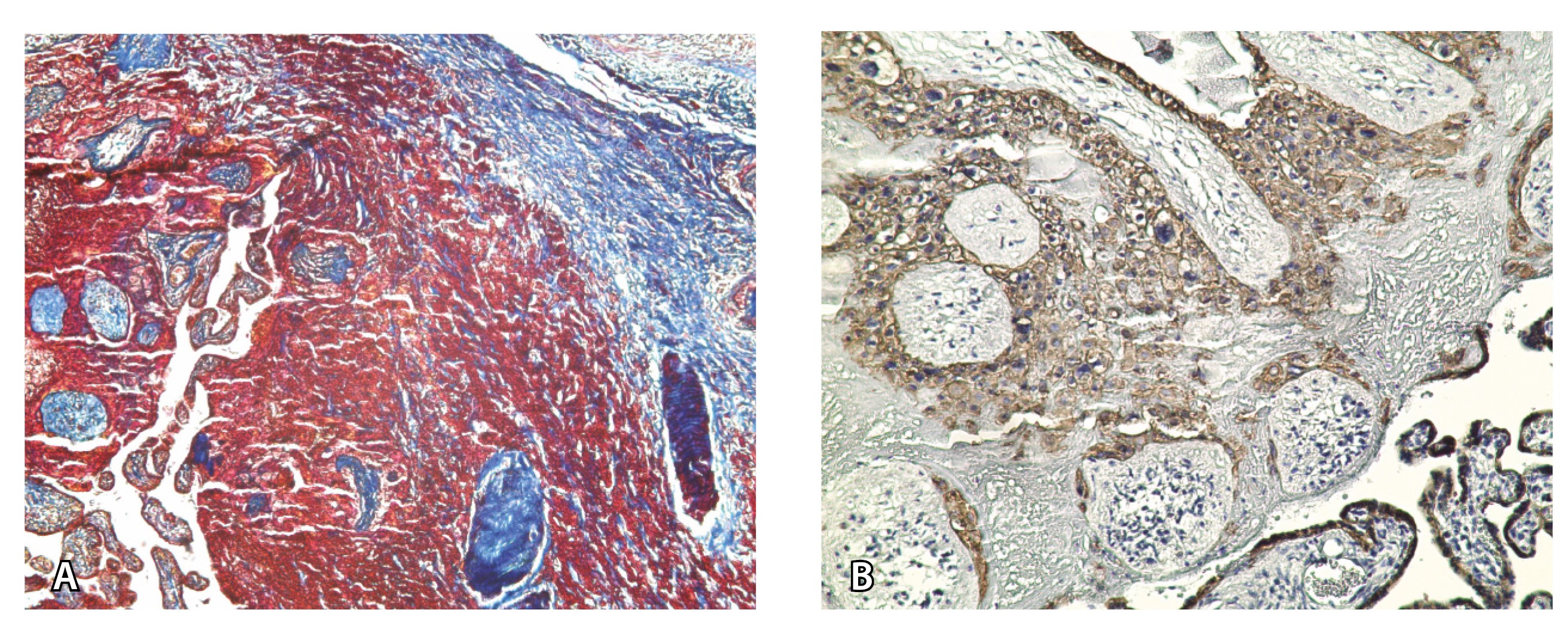 Рис. 5. Сосуды 2-го типа при гиперваскуляризации стенки матки при патологической инвазии: А – организованная ретрохориальная гематома в маточно-плацентарной области, в ее составе много инволютивных якорных ворсин (окраска по Маллори; × 100); Б – в составе гематомы видна пролиферация цитотрофобласта (иммуногистохимическое исследование, маркер цитокератин 8; × 100)