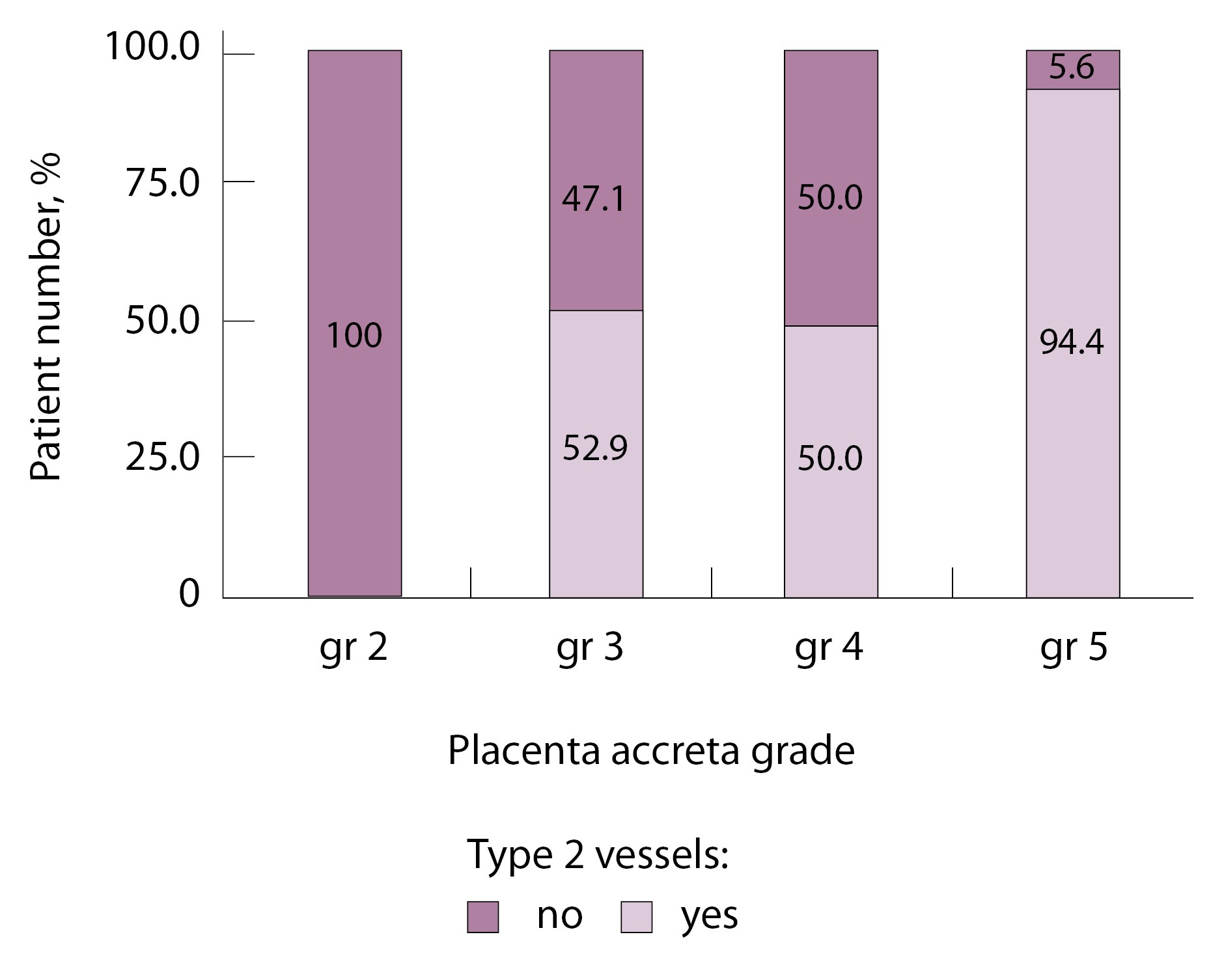Как видно на рис. 6, сосуды 2-го типа не встречались в норме и при плотном прикреплении плаценты (gr 2), с одинаковой частотой наблюдались при pl. accreta (gr 3) и pl. increta (gr 4) и были обнаружены у 94,4% пациенток с pl. percreta (gr 5) (р < 0,001, хи-квадрат Пирсона).