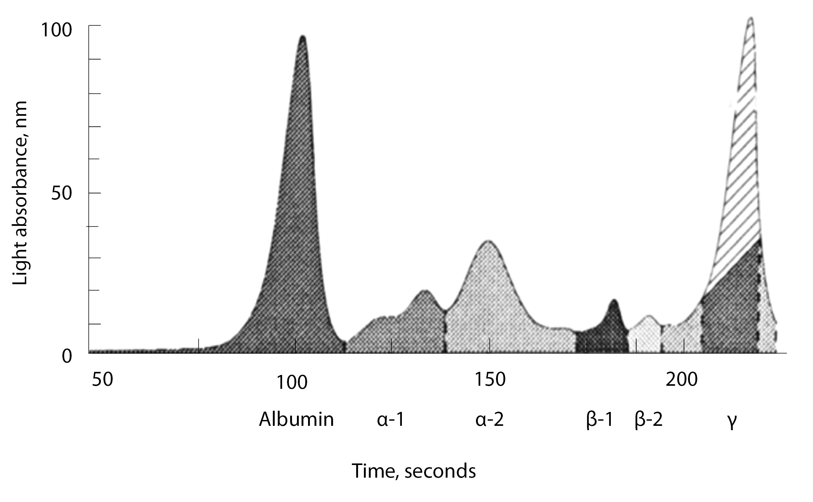 Рис. 5. Электрофорез белковых фракций. Заштрихован пик в зоне гамма-глобулинов, представленный иммуноглобулинами G и каппа. α-1 – альфа-1-глобулин, α-2 – альфа-2-глобулин, β-1 – бета-1-глобулин, β-2 – бета-2-глобулин, γ – гамма-глобулин