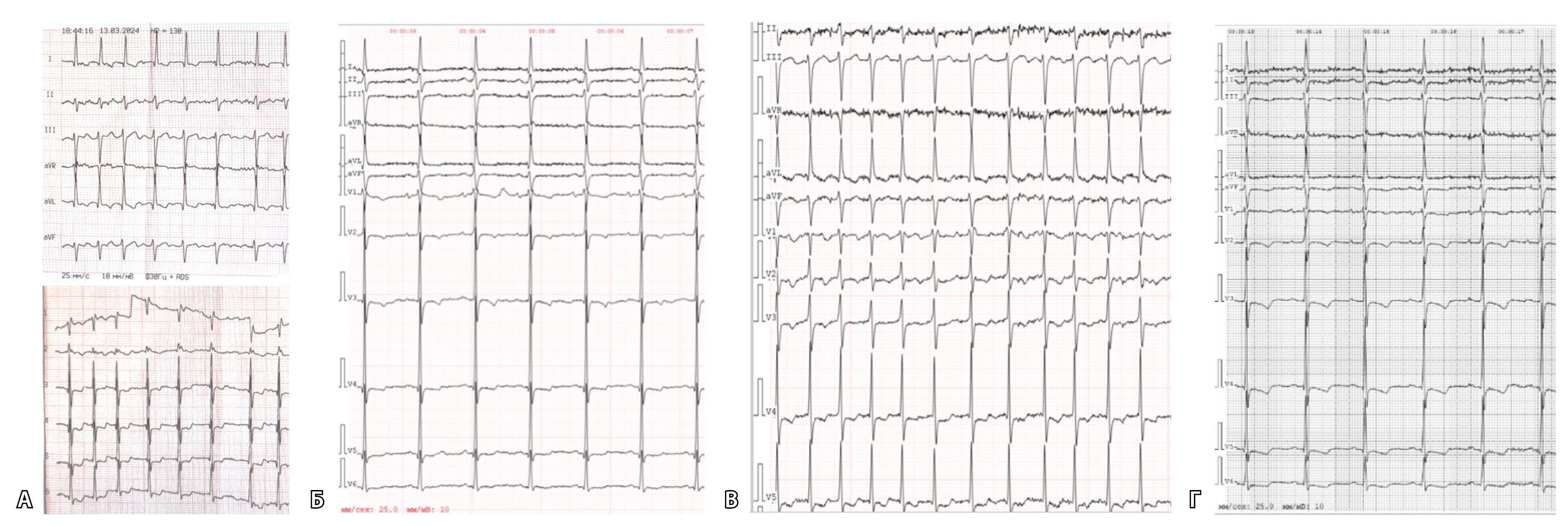 Рис. 1. Серия электрокардиограмм пациента: А – 13.03.2024, фибрилляция предсердий, частота сердечных сокращений (ЧСС) – 130 в минуту; Б – 14.03.2024, синусовый ритм, ЧСС – 75 в минуту; В – 20.03.2024, фибрилляция предсердий, ЧСС – 140 в минуту; Г – 21.03.2024, синусовый ритм, ЧСС – 71 в минуту