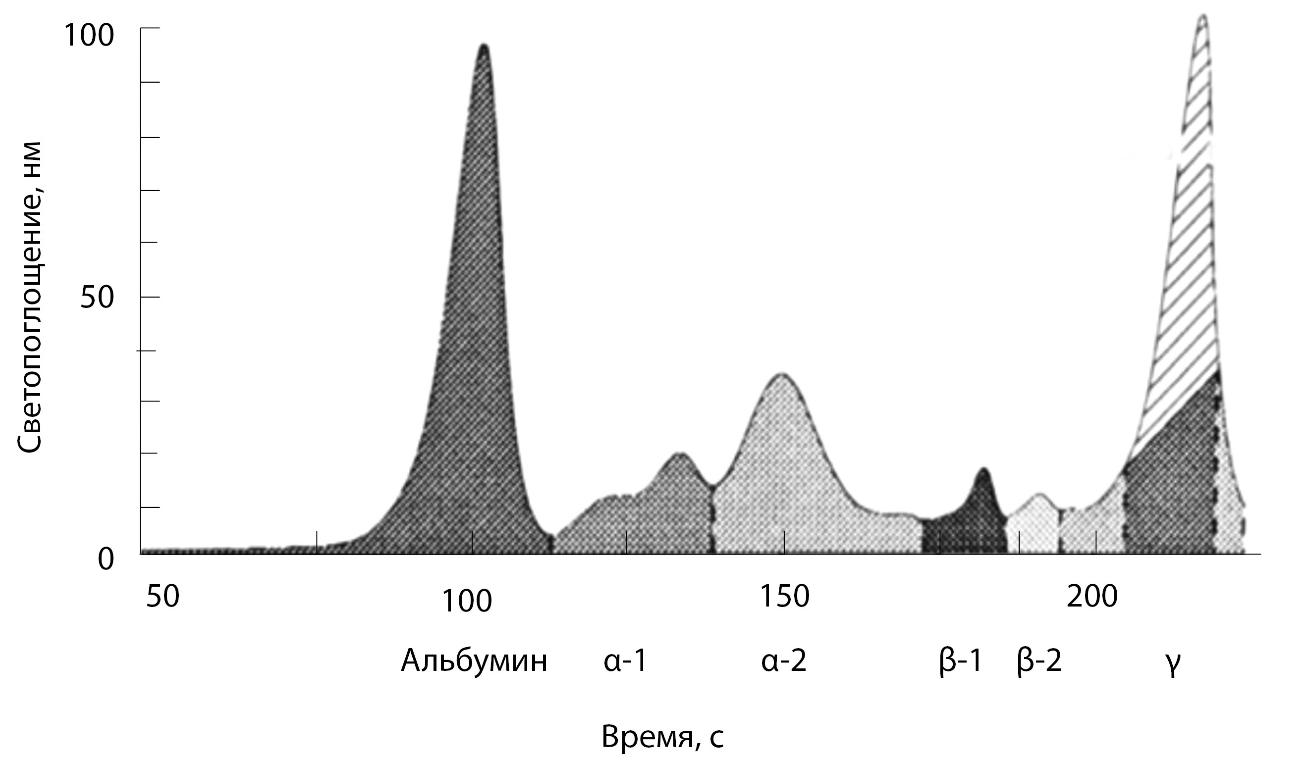 Рис. 5. Электрофорез белковых фракций. Заштрихован пик в зоне гамма-глобулинов, представленный иммуноглобулинами G и каппа. α-1 – альфа-1-глобулин, α-2 – альфа-2-глобулин, β-1 – бета-1-глобулин, β-2 – бета-2-глобулин, γ – гамма-глобулин