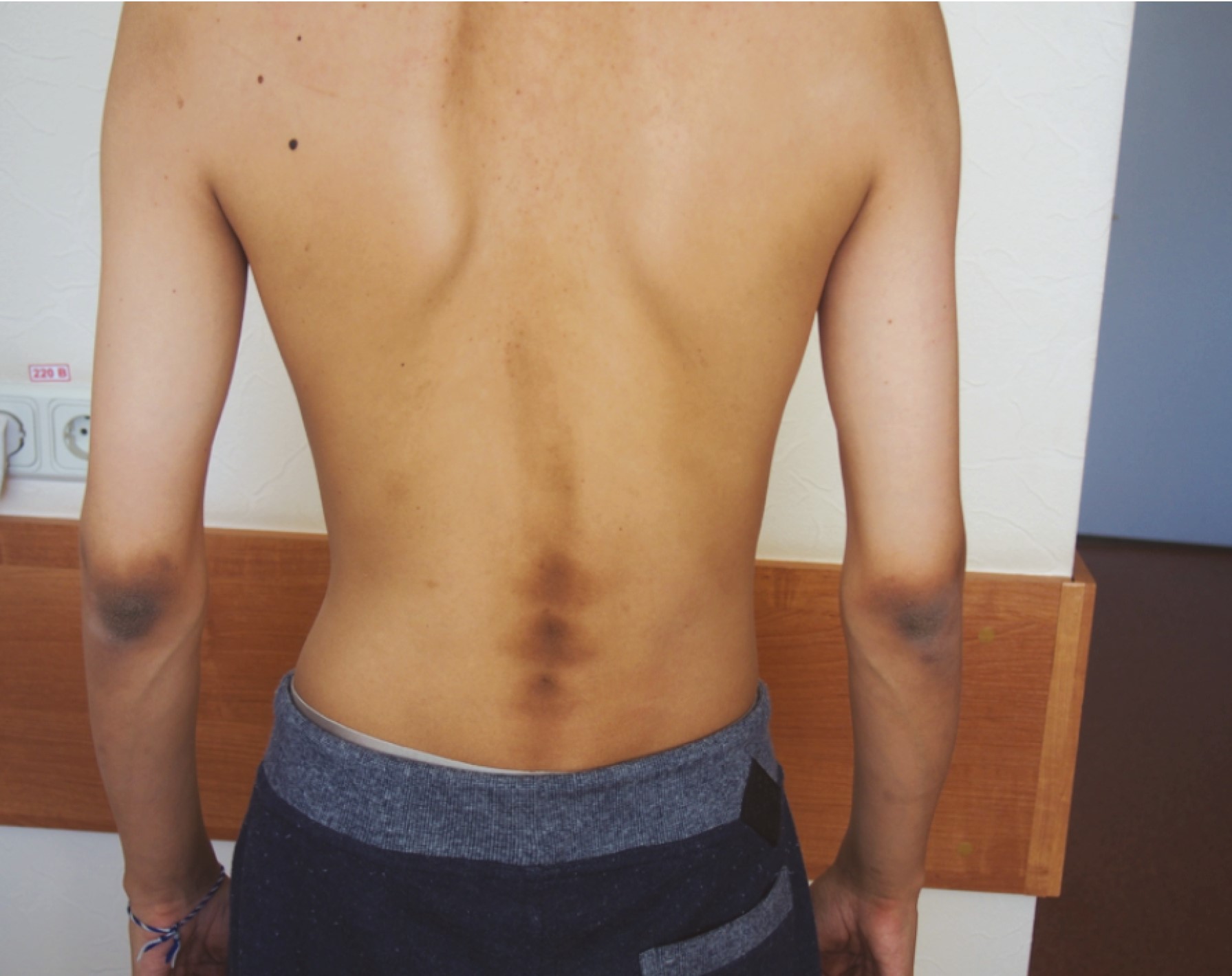 Последнее стационарное обследование в клинике эндокринологии проведено в возрасте 28 лет. Пациент предъявлял жалобы на повышенную утомляемость, периодически возникающую головную боль и судороги пальцев рук. При поступлении: рост – 170 см, масса тела – 49 кг, ИМТ – 16,96 кг/м2. Отмечается гиперпигментация в области локтей и поясницы (рис. 2), значимо менее выраженная по сравнению с более ранними наблюдениями. Подкожно-жировая клетчатка развита недостаточно, распределена равномерно. АД – 116/80 мм рт. ст., частота сердечных сокращений (ЧСС) – 70 уд/мин. Живот мягкий, безболезненный при пальпации во всех отделах. Печень по краю реберной дуги. Щитовидная железа не увеличена, плотно-эластичная, узлы не пальпируются. Симптомы Хвостека, Труссо – отрицательные.