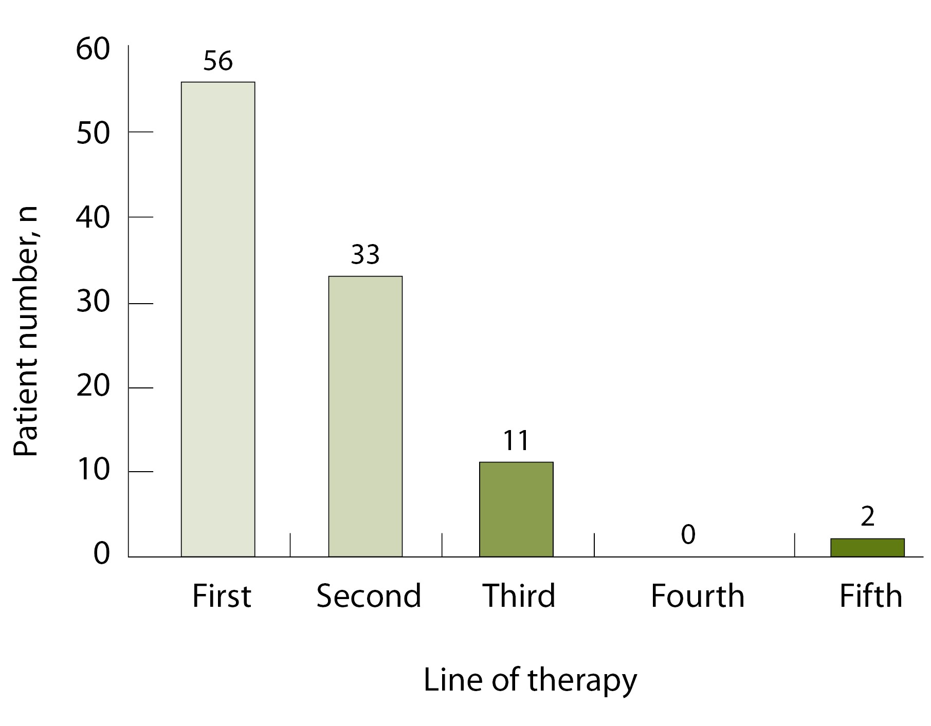 Более половины участников исследования (54,9%) до начала иммунотерапии ИКТИО не получали какого-либо лекарственного лечения онкологического заболевания (рис. 4). В целях анализа в эту подгруппу мы также включили пациентов, которым была рекомендована иммунотерапия ИКТИО в неоадъювантном или адъювантном режиме. Всем пациентам проводили иммунотерапию препаратом из группы ИКТИО в монорежиме. В 89,22% случаев использовали препарат из подгруппы анти-PD-1-моноклональных антител (ниволумаб получили 77 пациентов, пембролизумаб – 10, пролголимаб – 4), в 10,78% была назначена терапия анти-PD-L1-моноклональным антителом (у всех 11 пациентов применяли атезолизумаб).
