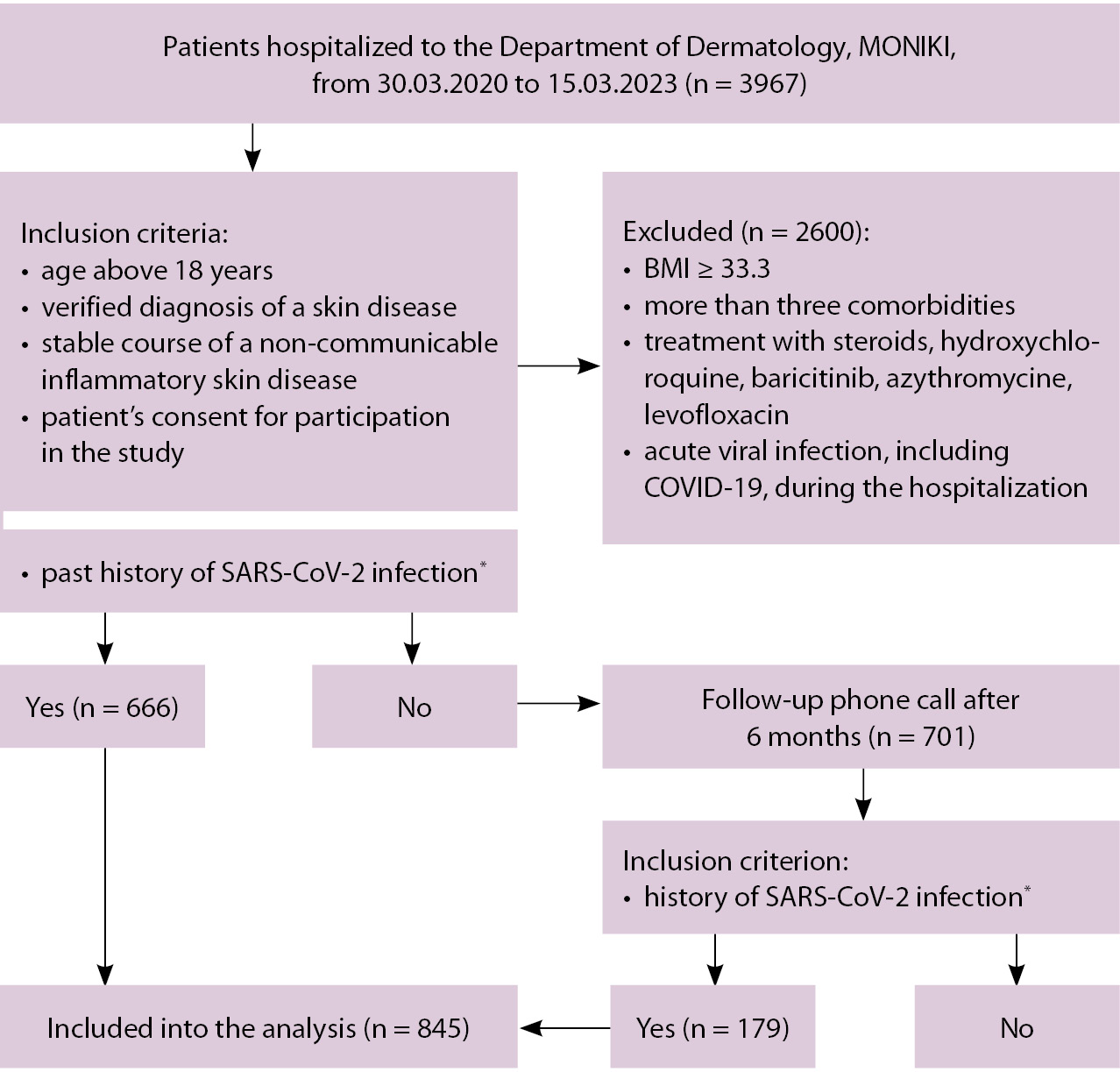 Все данные пациентов, отвечавших критериям соответствия, были занесены в два регистра в зависимости от факта наличия перенесенной НКИ в анамнезе, подтвержденной ПЦР-исследованием на SARS-CoV-2 или КТ-исследованием. Пациентов, не имевших НКИ в анамнезе, в среднем спустя 6 месяцев после выписки повторно опрашивали по телефону. В случае регистрации в процессе разговора информации о перенесенной за прошедшее время НКИ и при наличии подтверждающих медицинских заключений пациента приглашали на визит в дерматологическое отделение ГБУЗ МО МОНИКИ им. М.Ф. Владимирского для включения в исследование.