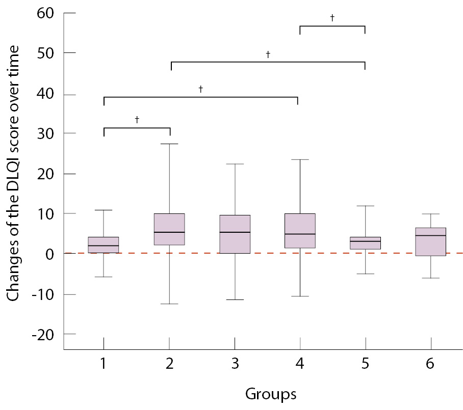 Рис. 3. Сравнение динамики индекса DLQI (разница значений после COVID-19 и до COVID-19) между группами, выделенными в зависимости от ведущего паттерна иммунопатогенетического механизма развития кожного заболевания (критерий Данна с поправкой Холма – Бонферрони); нулевая отметка (красная пунктирная линия) означает отсутствие изменений индекса. Статистическая значимость различий между группами: † p < 0,001