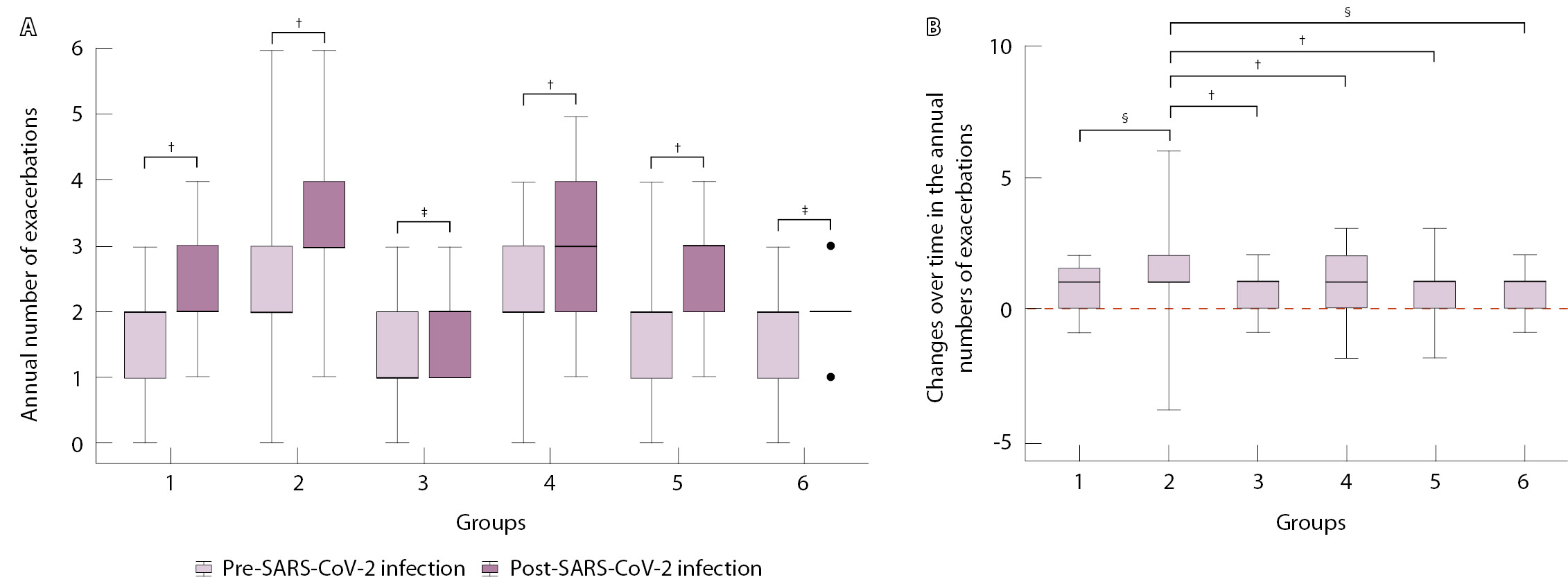 Рис. 4. Среднее количество обострений кожных заболеваний в год, предшествовавший пандемии COVID-19, и в год после перенесенной новой коронавирусной инфекции. А – динамика в группах, выделенных в зависимости от ведущего паттерна иммунопатогенетического механизма развития кожного заболевания. Б – сравнение динамики числа обострений (разница значений после COVID-19 и до COVID-19) между группами (критерий Данна с поправкой Холма – Бонферрони); нулевая отметка (красная пунктирная линия) означает отсутствие изменений индекса. Статистическая значимость различий между группами: § p < 0,05, ‡ p < 0,01, † p < 0,001