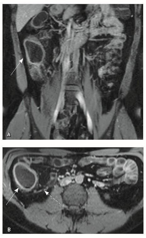 Рис. 3. Магнитно-резонансная энтерография, Т1-взвешенное изображение после внутривенного контрастного усиления (гадобутрол, 5 мл): А – фронтальная проекция, Б – аксиальная проекция. Наблюдается выраженное усиление интенсивности сигнала от восходящего отдела ободочной кишки (стрелка), усиление сигнала от окружающей клетчатки (пунктирная стрелка)