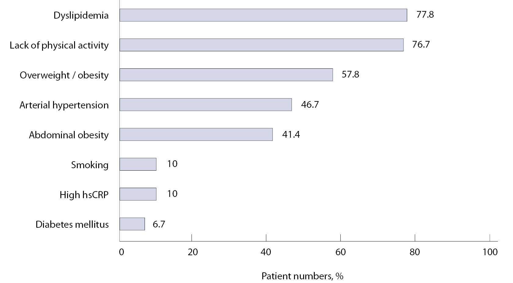 Среди традиционных факторов риска ССЗ наиболее часто встречалась дислипидемия (77,8%), доля которой была выше популяционного показателя [12], что, возможно, связано с применением ингибиторов ароматаз, обладающих известным неблагоприятным влиянием на липидный профиль [13]. Частота выявления АГ, избыточной массы тела / ожирения и курения не превышала показатели для популяции российских женщин 45–54 лет, определенные в эпидемиологическом исследовании ЭССЕ-РФ [14].