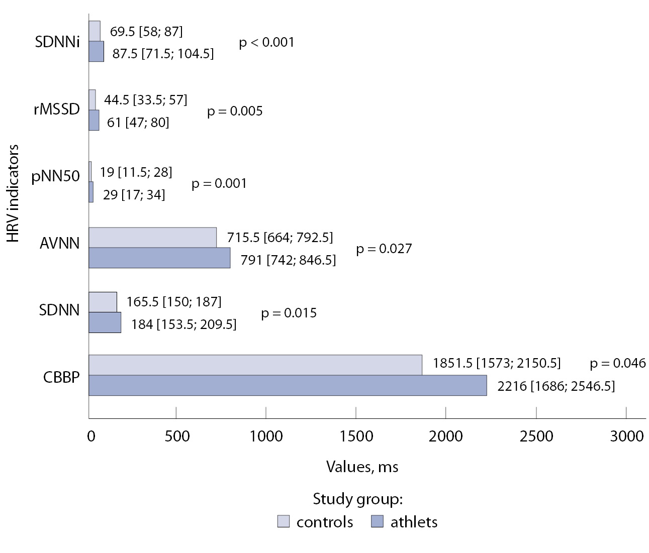 Параметр, Me [Q1; Q3], уд/мин | Группа спортсменов (n = 86) | Контрольная группа (n = 74) | Значение р |