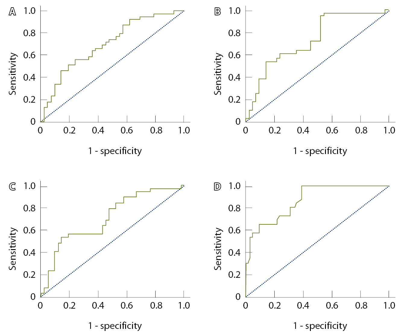 Рис. 2. Результаты ROC-анализа для прогнозирования ухудшения спортивного результата (А – ROC-кривая для SII, AUC = 0,705; Б – ROC-кривая для AISI, AUC = 0,733; В – ROC-кривая для SIRI, AUC = 0,713) и для прогнозирования спортивного травматизма (Г – ROC-кривая для ИСЛМ, AUC = 0,870). AISI (aggregate index of systemic inflammation) – совокупный индекс системного воспаления, SII (systemic immune inflammation index) – индекс системного воспаления, SIRI (system inflammation response index) – индекс ответа на системное воспаление, ИСЛМ – индекс соотношения лимфоцитов и моноцитов