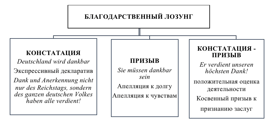 В немецкой политической коммуникации речевой акт благодарности (прямой и косвенный) может быть выражен в форме лозунга. Благодарственный тип лозунга, или лозунговая благодарность, представляет собой речевое высказывание, манифестирующее какую-либо определенную программную идею, на которое наслаивается интенция благодарения (долга или необходимости). Подобные благодарственные высказывания имеют агитационный характер, поскольку они направлены на изменение состояния адресата, особенно в тех случаях, где содержится призыв к благодарению, и на изменение оценочных суждений реципиентов. Прототипическая формула такого лозунга включает следующие шаги: Адресант, Стимул/повод (обязательно бенефактивный), сама Благодарность – и выражает идею о том, кто за что благодарен, должен быть благодарен, будет благодарен, должен быть отблагодарён, заслуживает благодарности и т. д. Промежуточным необлигаторным шагом может являться директивное указание на того, кому должна быть выражена благодарность адресанта (или на кого направлена). Поводы благодарности практически не эксплицируются в самих благодарственных актах, но при этом зачастую отражены в пропозиции. В содержательном аспекте благодарственный лозунг в политической коммуникации может постулировать: саму благодарность; прогностическую благодарность; необходимость выражения благодарности; призыв быть благодарным (эксплицитный/имплицитный призыв); благодарность-манипуляцию; прогностическую неблагодарность. В благодарственных лозунгах в период 30–50-х гг. превалируют следующие лозунговые слова: Generation, Volk, Bevölkerung, Deutschland, Arbeiterschaft, Zukunft/zukünftige, Dank, Reichstag, Dank des Landes, Dank des Vaterlandes. Благодарственные лозунги можно классифицировать как констатации, призывы, констатации-призывы, все они являются декларативными. Чаще всего пару смежности они составляют с требованиями, призывами и просьбами. Их комбинаторность обусловливает двустороннее влияние друг на друга и наслоение на благодарность характеристик и установок лозунга. Всё вышеизложенное и тот факт, что лозунговая благодарность предстает в политической коммуникации не как фатическая, а как персуазивная, направленная на изменение оценочных суждений массового адресата и имеющая манипулятивный и агитационный характер, позволяет нам отнести лозунговую благодарность к определенной разновидности политических лозунгов.