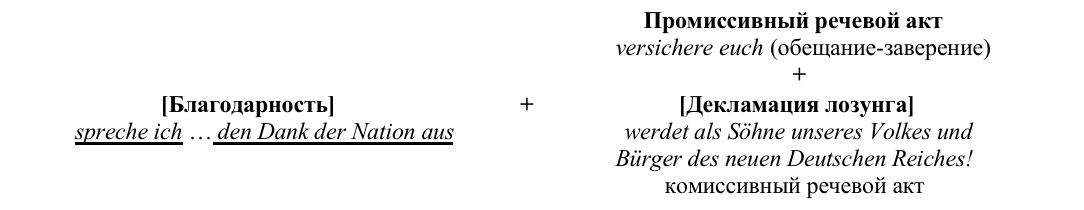 Другой вопрос, который касается классификации благодарственных лозунгов, напрямую связан с тем, что высказывания с интенцией благодарности часто образуют пару смежности с другим речевым актом, в составе которого актуализируется лозунг. Поскольку лозунг выражен краткой, емкой клишированной и эмоционально окрашенной фразой, то и акт благодарности, предваряющий лозунг, получает от него дополнительный эмоциональный заряд и сам становится частью лозунга. К тому же благодарность усиливает следующий за ней лозунг, и это связано в первую очередь с ее эмотивной функцией, например: So spreche ich euch denn als des deutschen Volkes Führer und des Reiches Kanzler im Namen aller Deutschen, deren Sprecher ich in diesem Augenblicke bin, den Dank der Nation aus und versichere euch des Glückes, das uns in dieser Stunde bewegt, da ihr nun wieder bei uns sein werdet als Söhne unseres Volkes und Bürger des neuen Deutschen Reiches!. В данном случае мы наблюдаем триаду: речевой акт благодарности, промиссивный речевой акт и лозунг (рис. 2).