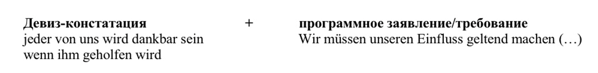 Призывы и девизы близки к лозунгам и чаще всего включаются в речи как лозунги. Поэтому в коммуникативном фрагменте Jeder von uns im Saal brauchte einmal eine Bildung, vielleicht sogar eine Weiterbildung. Wer bisher auf Spital und Pflege verzichten konnte, kann sich glücklich schätzen. Gewiss jeder von uns wird einmal froh und dankbar sein, wenn ihm geholfen wird. Wir müssen unseren Einfluss geltend machen, dass wir Gesetze und Kontrollorgane haben, die einen Missbrauch aufdecken und zu verhindern wissen девиз Gewiss jeder von uns wird einmal froh und dankbar sein, wenn ihm geholfen wird становится лозунгом государственной политики, при котором каждый имеет право на получение медицинской помощи, и эта идея далее раскрывается в программном заявлении и требовании необходимости использования законодательных и контролирующих органов в области здравоохранения (рис. 3).