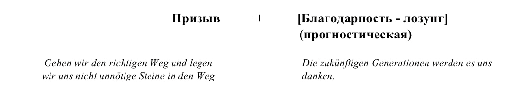 В следующем примере мы можем наблюдать лозунг-призыв и усиливающий и подтверждающий его благодарственный лозунг-констатацию: Gehen wir den richtigen Weg und legen wir uns nicht unnötige Steine in den Weg. Die zukünftigen Generationen werden es uns danken (констатация положительного исхода положения дел) (рис. 4).