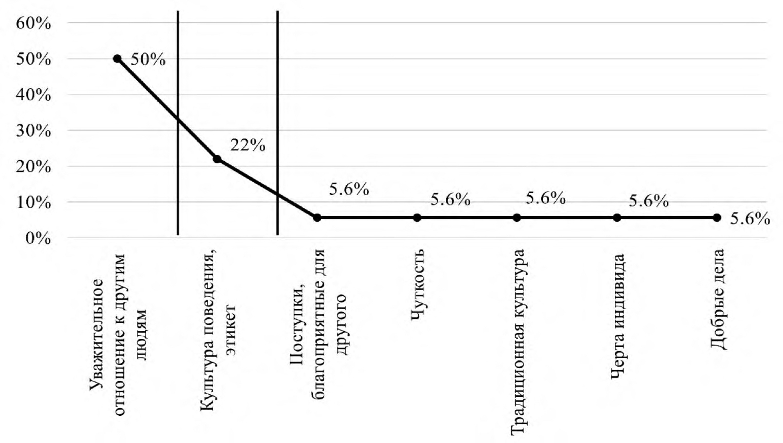 В ответах магистрантов выделено уже 8 семантических компонентов: 1) уважительное отношение к людям; 2) культура поведения, этикет; 3) поступки, благоприятные для другого; 4) чуткость; 5) традиционная культура; 6) добрые дела; 7) воспитанность; 8) самоусовершенствование.