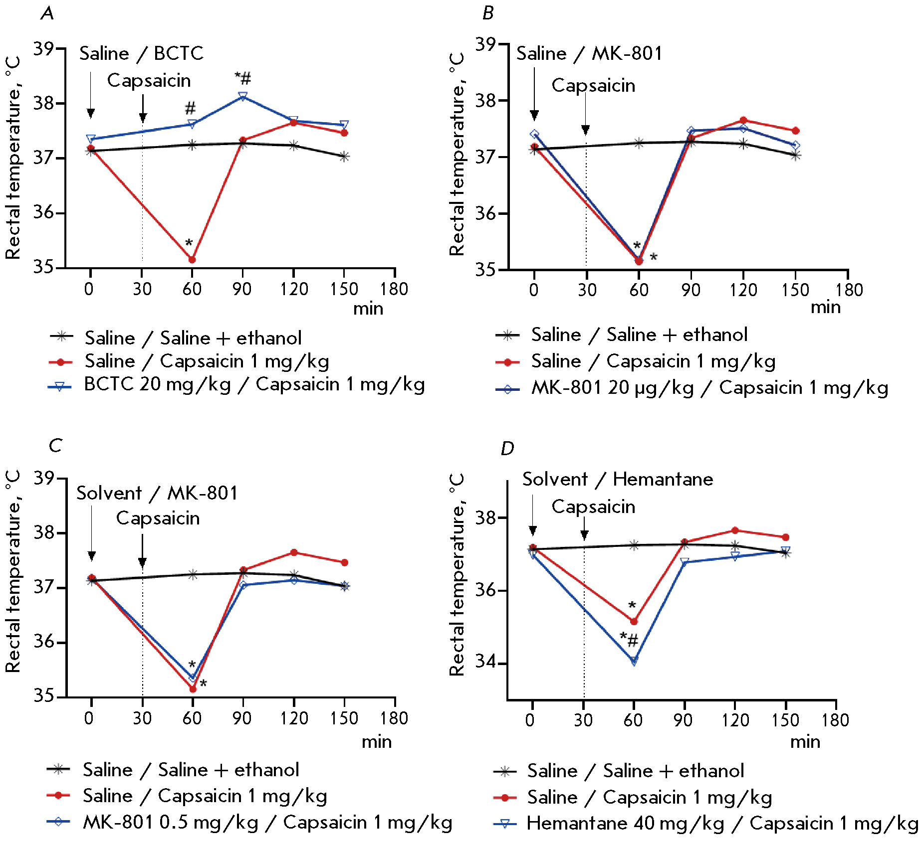 Hence, the thermal pain threshold was significantly lower in the group of animals that had preventively (before capsaicin injection) been administered the selective TRPV1 ion channel antagonist (BCTC) or NMDA receptor antagonists (hemantane and MK-801) than that in mice that had received capsaicin and saline. This demonstrates that NMDA receptor antagonists and BCTC (a TRPV1 ion channel antagonist) exhibit similar activities. These agents suppressed the effect of capsaicin on TRPV1 ion channels that causes their desensitization and, therefore, significant increase in the thermal pain threshold.