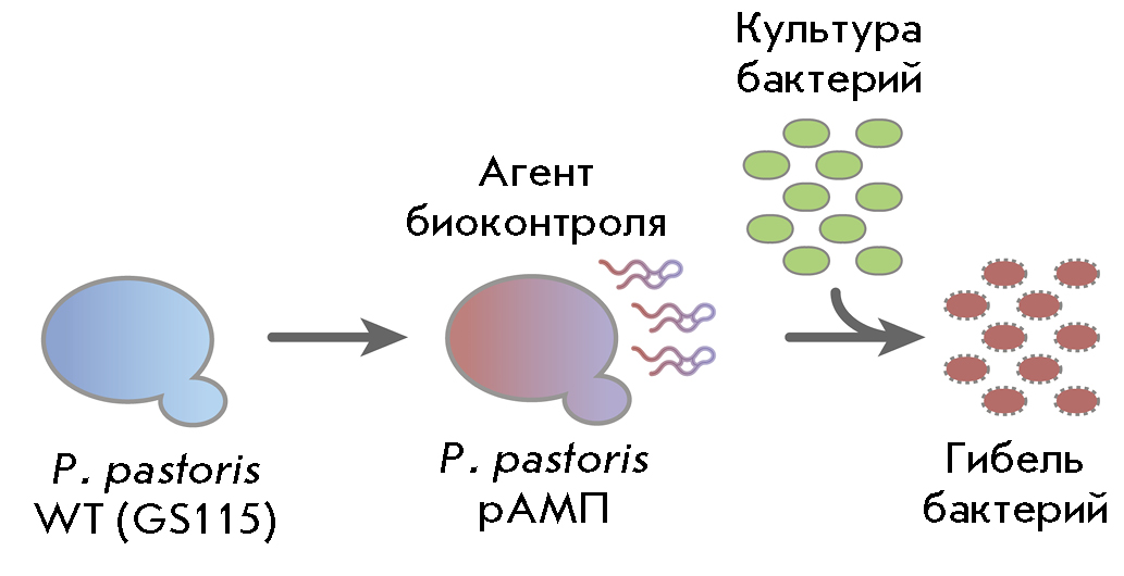 Рис. 1. Схематическое представление генетического программирования штаммов дрожжей P. pastoris и создания рекомбинантного агента биоконтроля. Клетки дрожжей дикого типа (P. pastoris WT GS115) трансфицируют генетической конструкцией для продукции секретируемой АМП; кокультивирование полученного агента биоконтроля (P. pastoris рАМП) с бактерией-мишенью приводит к гибели этой бактерии