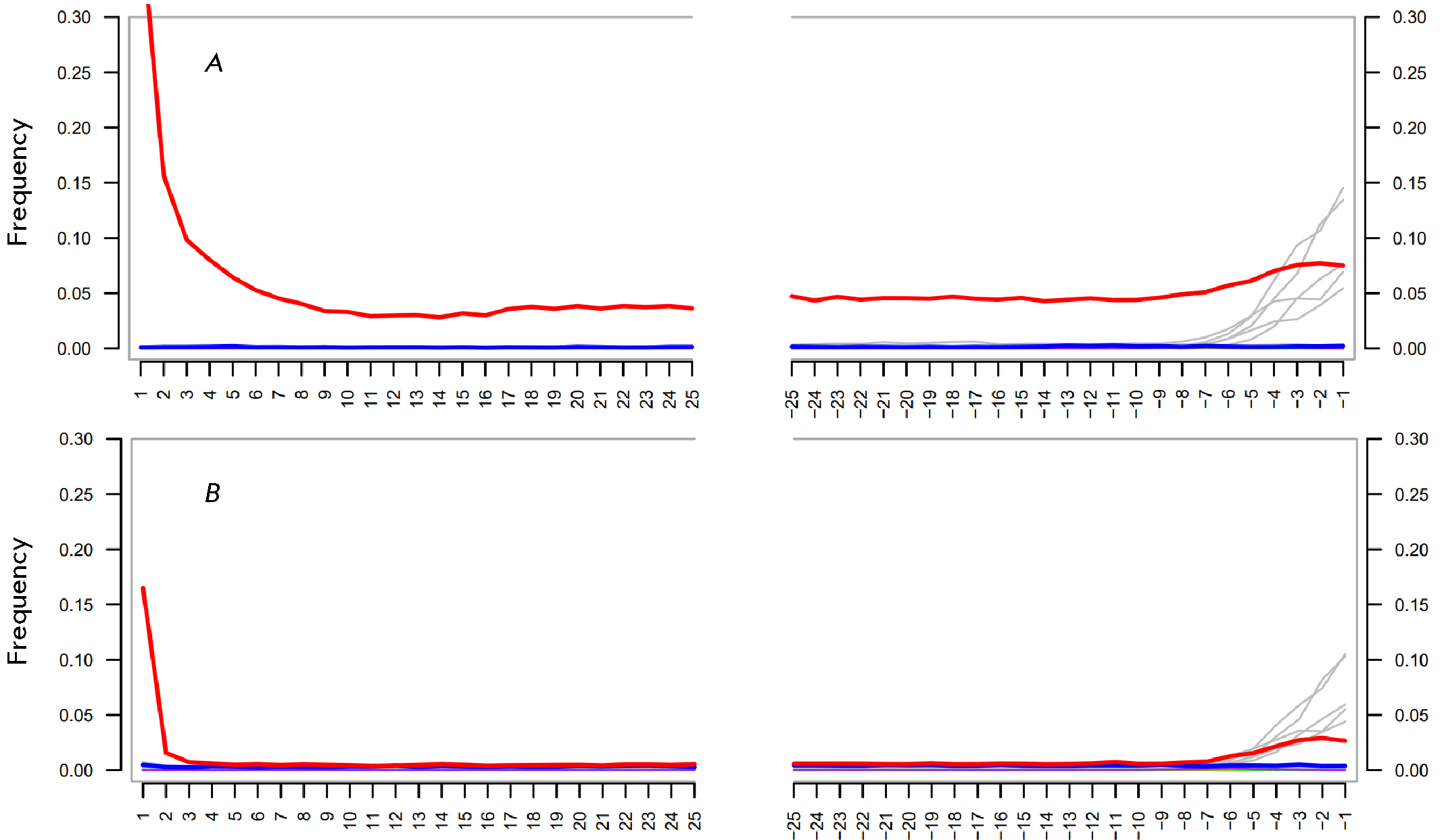 Fig. 1. Postmortem damage patterns of DNA libraries generated using MapDamage 2.0. (A) – Library without UDG treatment (KLD_SG), false C→T transitions are represented by the red line (the blue line denotes complementary G→A transitions) at 5’ (positive coordinates) and 3’ ends (negative coordinates) of the last 25 nucleotides. The presence of C→T substitutions after the second reading (right half of the graph) of the complementary strand is due to the particulars of the single-strand library preparation. The drop in the deamination level for the nucleotides -5 and -1 is due to A-tailing and the experimental protocol used. (B) – Damage pattern in the library partially treated with UDG (KLD_UDG) and obtained from the same extract