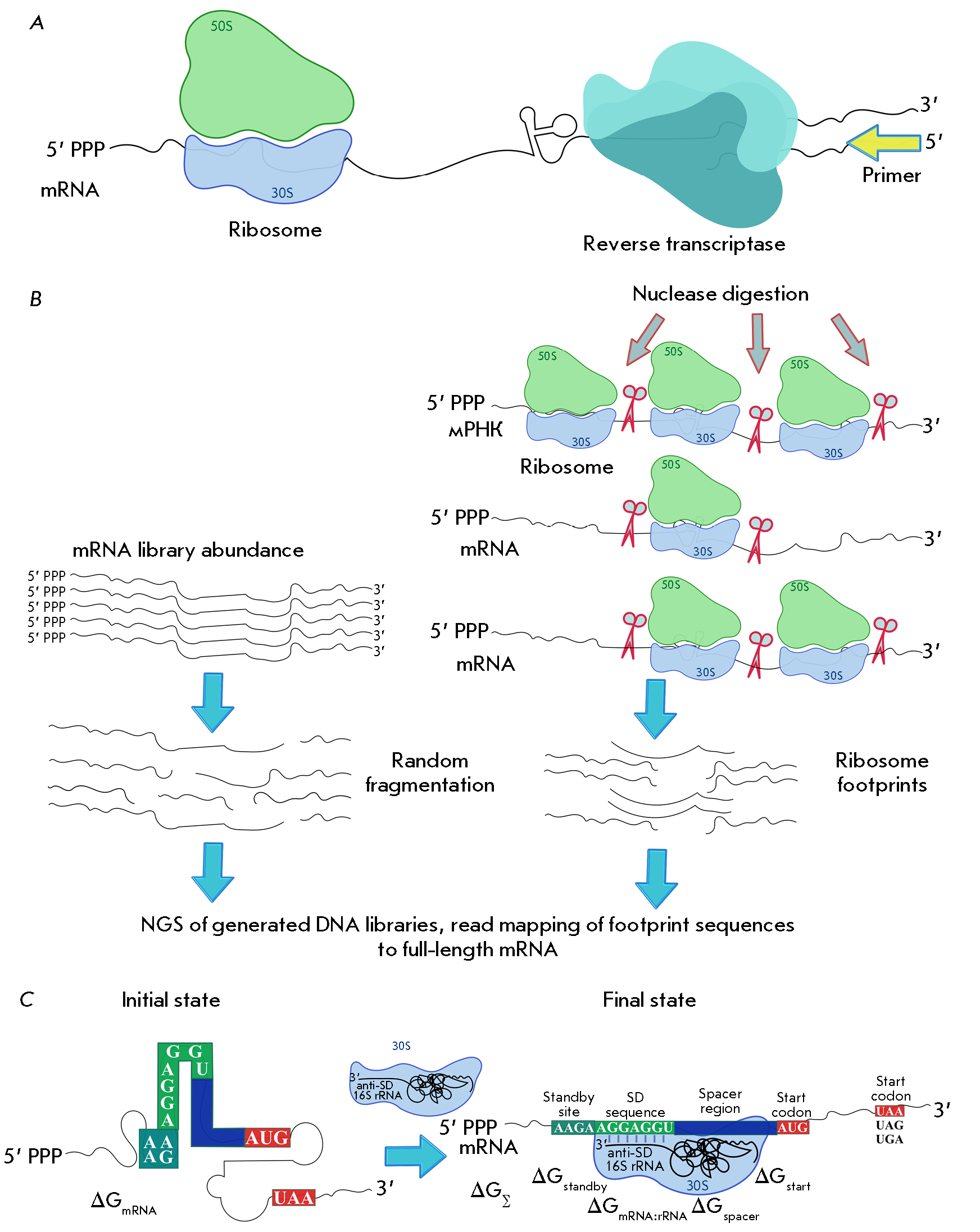 Fig. 2. (A) – The principle of the toeprinting technique. Stable ribosome complexes stop reverse transcriptase at a specific mRNA position, thus generating short cDNA products of a specific length. Primers for reverse transcriptase can be radioactively or fluorescently labeled. (B) – The scheme of the ribosome profiling method (Ribo-seq). After translation initiation, mRNA is cut by a specific nuclease at the sites where it is not protected by ribosomes. In parallel, the original mRNA library is prepared for sequencing by random fragmentation. It will be used as a reference sequence. All obtained ribosome footprints are used to prepare a DNA library, which is further deeply sequenced. Based on the NGS results, footprint sequence reads are mapped to full-length mRNA. (C) – The thermodynamic model of bacterial translation initiation. Changes in free energy during the initiation stage depend on the five types of molecular interactions defining the initial and the final states of the system. The drawing was executed in the Inkscape software
