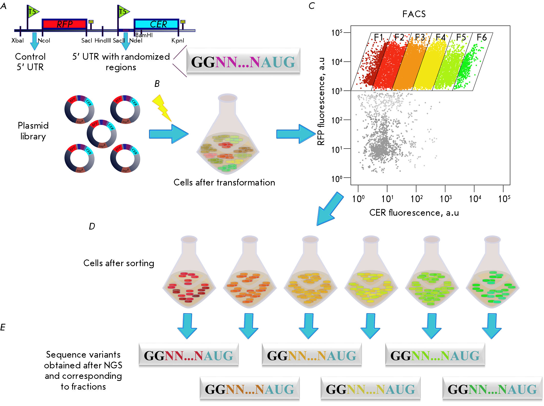 Fig. 3. The scheme of the Flow-seq method (as exemplified by working with randomized 5’ UTR upstream of the CER protein gene and control 5’ UTR upstream of the RFP protein gene). The stages of plasmid library construction, transformation, sorting, and sequencing are presented. (A) – Cloning of a randomized DNA fragment into a reporter vector upstream of the CER protein gene. A constant 5’ UTR is retained upstream of the RFP protein gene. (B) – Electroporation of the entire plasmid library into E. coli cells. (C) – Cell separation based on the CER/RFP fluorescence intensity ratio by a cell sorter. (D) – Cell fraction collection (e.g., F1–F6) according to the CER/RFP ratio. (E) – DNA isolation and randomized region amplification followed by high-throughput sequencing (NGS). The drawing was executed in the Inkscape software