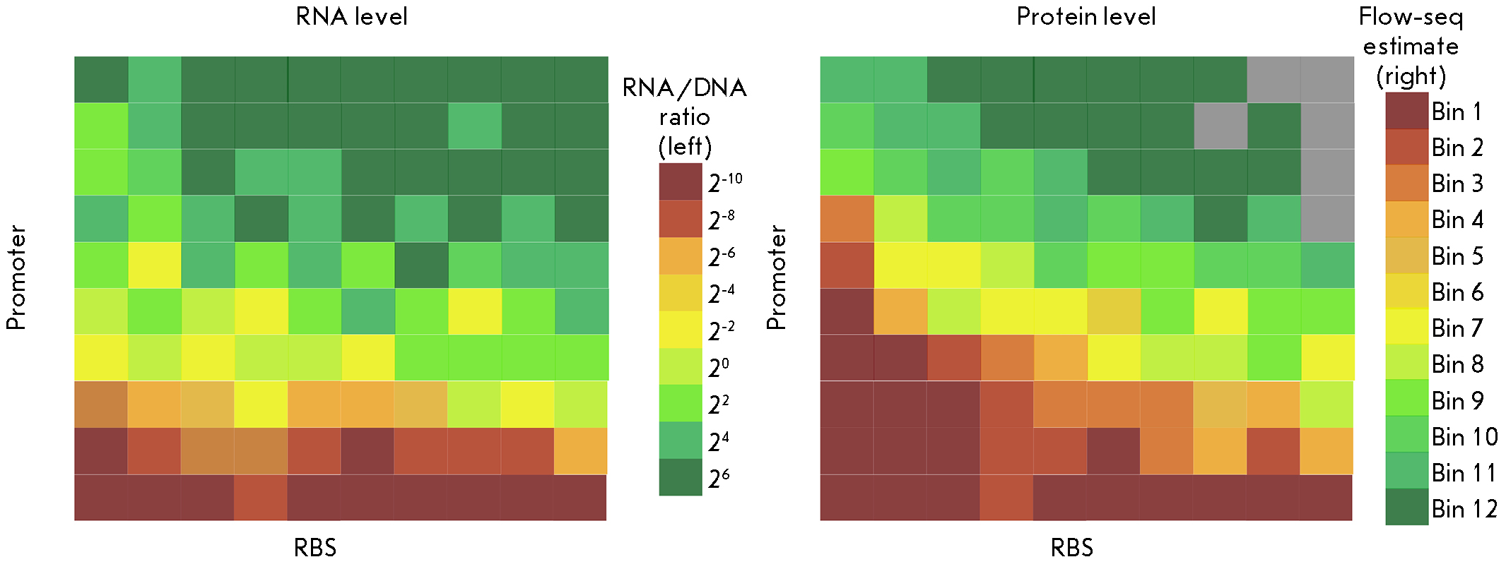 Fig. 4. A schematic image of the exemplary representative maps of RNA and protein synthesis efficiency levels. RNA (left) and protein (right) levels for a small set of constructs are gridded according to the identity of the promoters (the Y axis) and ribosome binding sites (RBS, the X axis). Promoters and RBSs are sorted in ascending order of the average efficiency of RNA and protein synthesis, respectively. Gray cells indicate constructs corresponding to levels below an empirically defined threshold. Scales of RNA levels (the RNA to DNA ratios) and protein levels (ratios of GFP (green) to RFP (red) fluorescence proteins) are shown to the right of their respective maps. The drawing was executed based on the source [67] in the Inkscape software