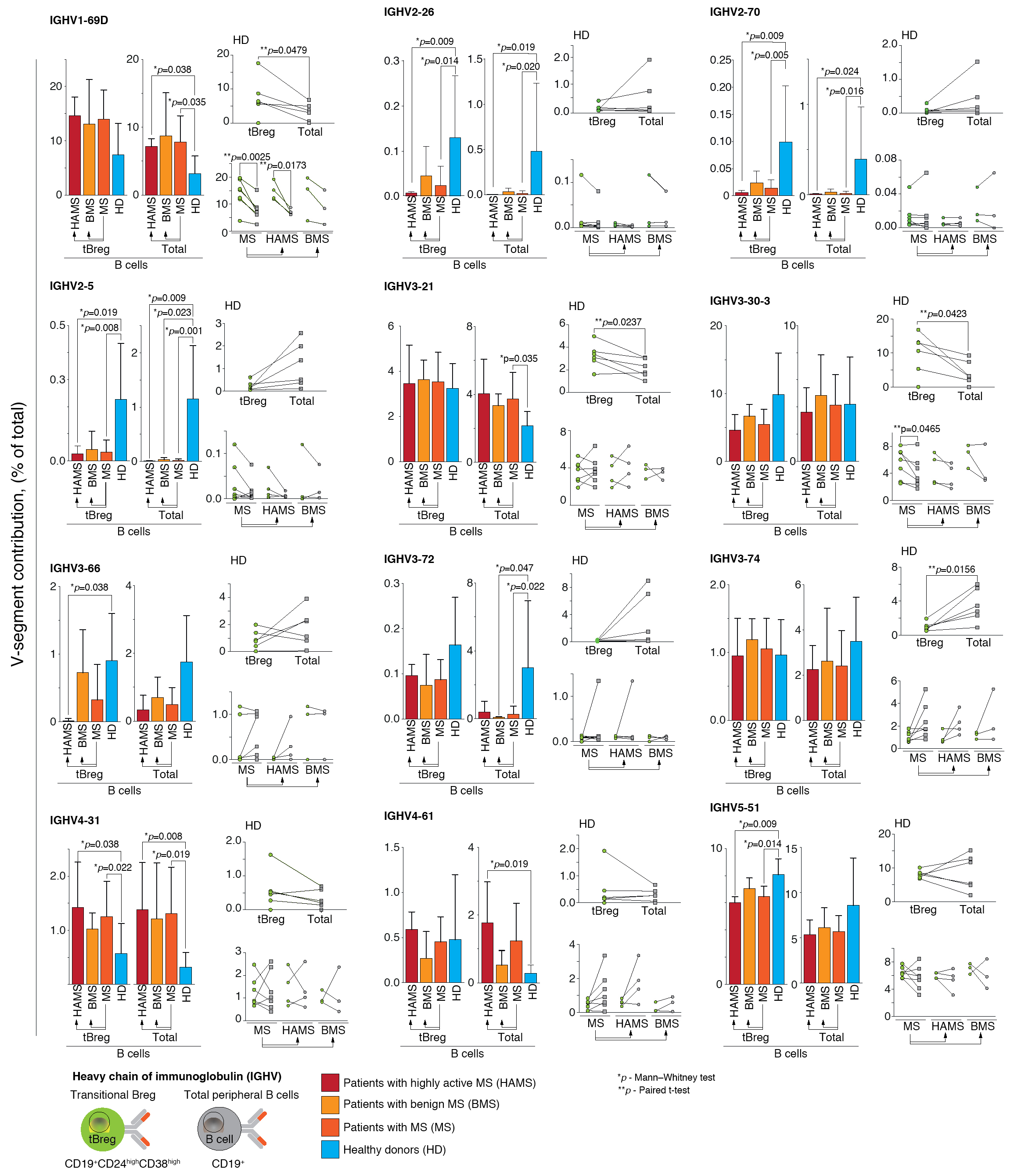 Fig. 1. Differential usage of germline Ig VH-gene segments in MS patients and healthy donors. The frequency of 49 functional VH genes in patients with MS, separately for BMS and HAMS, was analyzed. The frequency of VH germline genes in healthy donors (HD) was analyzed as a control. The distribution of the germline gene repertoire was compared between the total pool of peripheral blood B cells (CD19+) and tBregs with the CD19+CD24highCD38high phenotype. Histograms show the comparison of patients with different types of MS courses to healthy donors, where the average value (mean ± SD) of the proportion of IgG sequences related to the indicated germline is provided for each group. The individual values of the proportion of immunoglobulin germline genes for each patient are compared for the total pool of B cells (total, gray dots) and the subpopulation of transient regulatory B cells (tBregs, green dots) and shown to the right of the histogram. The data are provided only for the germline genes for which a statistically significant difference was shown in at least one analyzed parameter (comparison of different types of MS courses against healthy donors was performed using the Mann–Whitney test; comparison of the total pool of B cells with the tBreg subpopulation was performed using the paired t-test; only statistically significant p-values are shown)