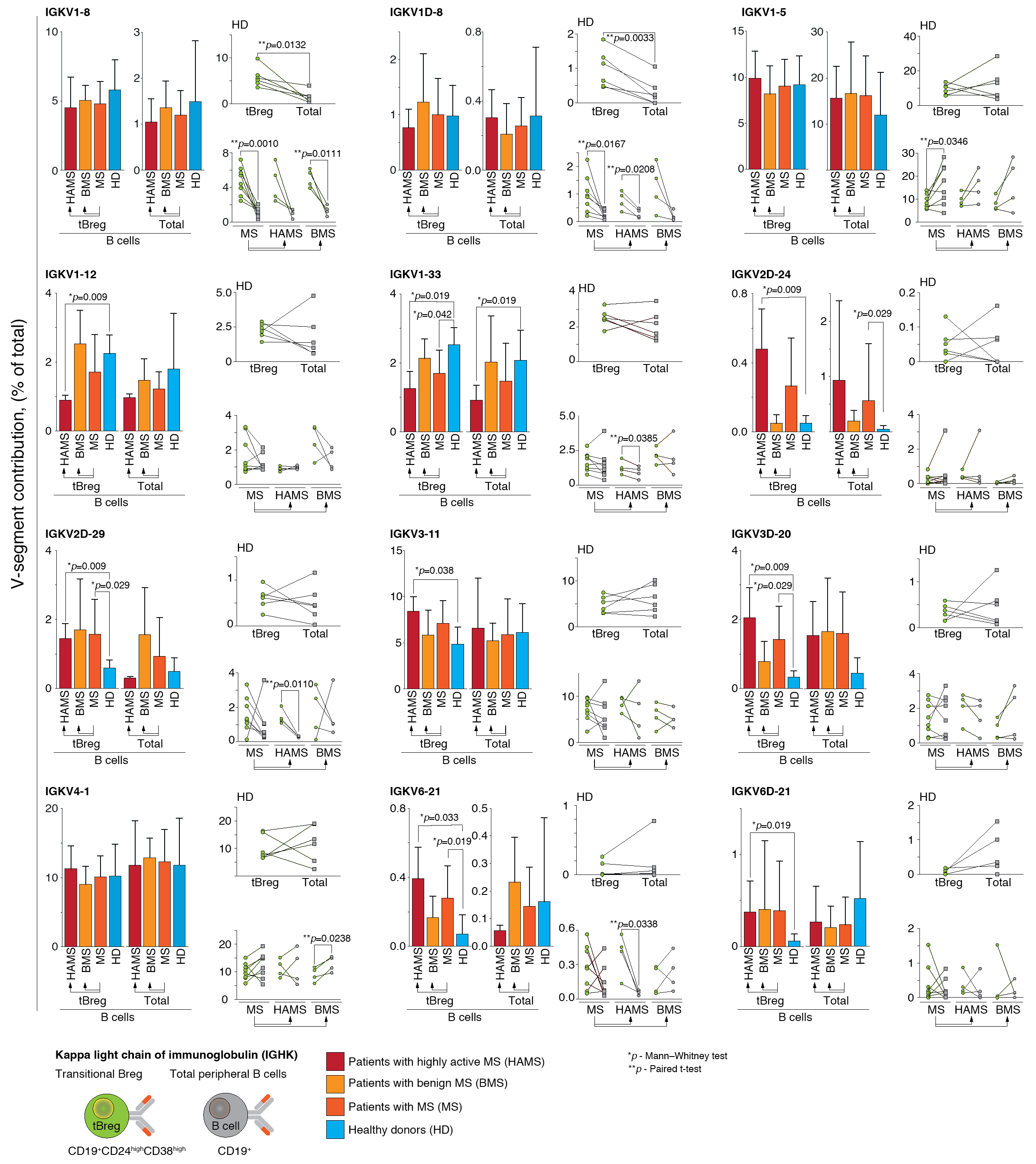 Fig. 2. Differential usage of germline Ig Vk-gene segments in MS patients and healthy donors. Frequency of 41 functional Vk genes in MS patients, separately for BMS and HAMS patients, was analyzed. The frequency of Vk germline genes in healthy donors (HD) was analyzed as a control. The distribution of the germline gene repertoire was compared between the total pool of peripheral blood B cells (CD19+) and tBregs with the CD19+CD24highCD38high phenotype. Histograms show the comparison of patients with different types of MS course and healthy donors, where the average value (mean ± SD) of the proportion of IgG sequences related to the indicated germline is provided for each group of patients. Individual values of the proportion of immunoglobulin germline genes for each patient are compared for the total pool of B cells (total, gray dots) and the subpopulation of transient regulatory B cells (tBregs, green dots) and shown to the right of the histogram. The data are provided only for germline genes, for which a statistically significant difference was shown in at least one analyzed parameter (comparison of patients with different types of MS course against healthy donors was performed using the Mann–Whitney test; comparison of the total pool of B cells with the subpopulation of tBregs was performed using the paired t-test; only statistically significant p-values are shown)