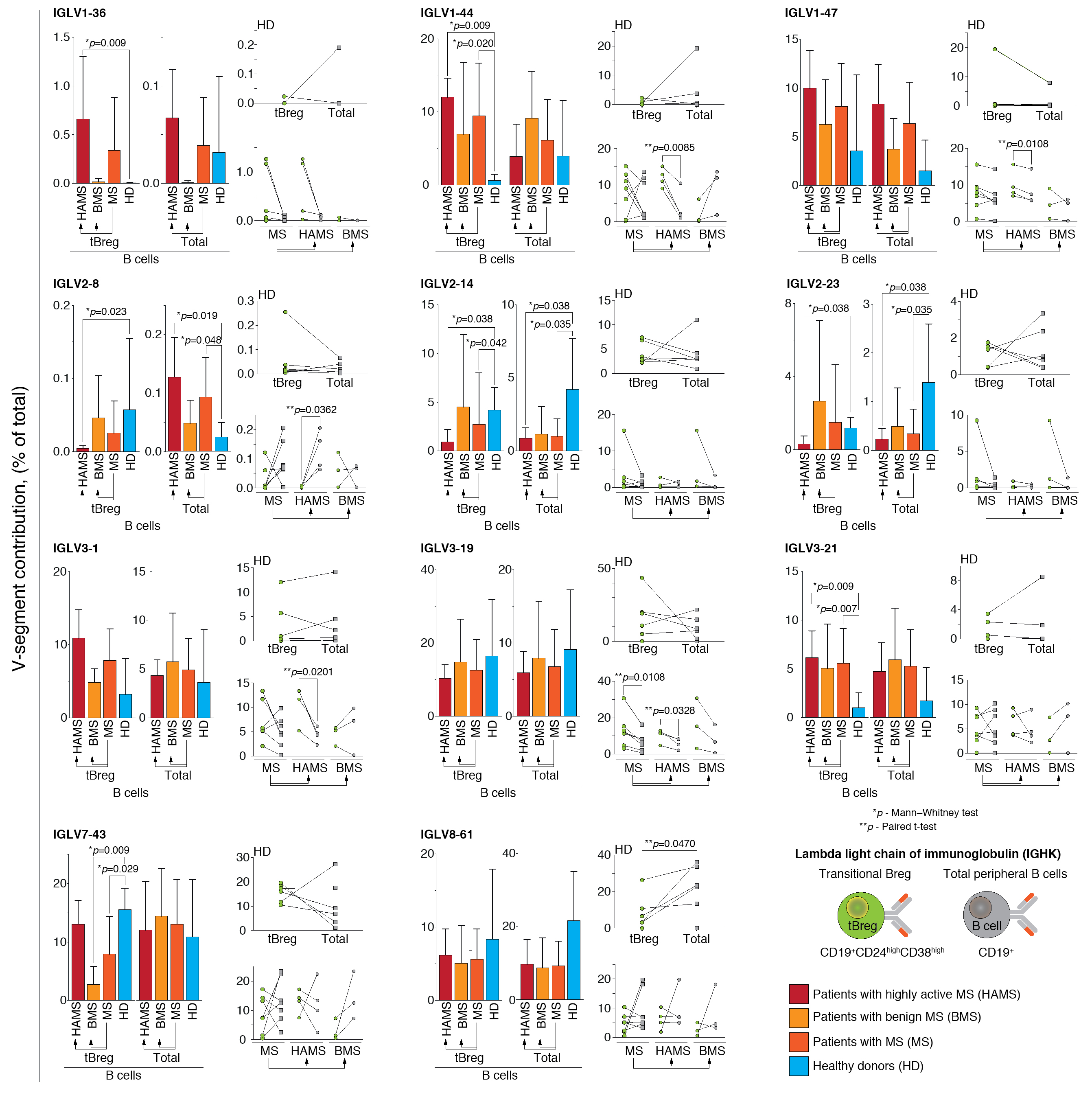 Fig. 3. Differential usage of germline Ig Vλ-gene segments in MS patients and healthy donors. Frequency of 26 functional Vλ genes in MS patients, separately for BMS and HAMS patients, was analyzed. The frequency of Vλ germline genes in healthy donors (HD) was analyzed as a control. The distribution of the germline gene repertoire was compared between the total pool of peripheral blood B cells (CD19+) and tBregs with the CD19+CD24highCD38high phenotype. Histograms show a comparison of patients with different types of MS courses and healthy donors, where the average value (mean ± SD) of the proportion of IgG sequences related to the indicated germline is provided for each group. Individual values of the proportion of immunoglobulin germline genes for each patient are compared for the total pool of B cells (total, gray dots) and the subpopulation of transient regulatory B cells (tBregs, green dots) and shown to the right of the histogram. The data are provided only for the germline genes for which a statistically significant difference was shown in at least one analyzed parameter (comparison of patients with different types of MS courses against healthy donors was performed using the Mann–Whitney test; comparison of the total pool of B cells with the subpopulation of tBregs was performed using the paired t-test; only statistically significant p-values are shown)