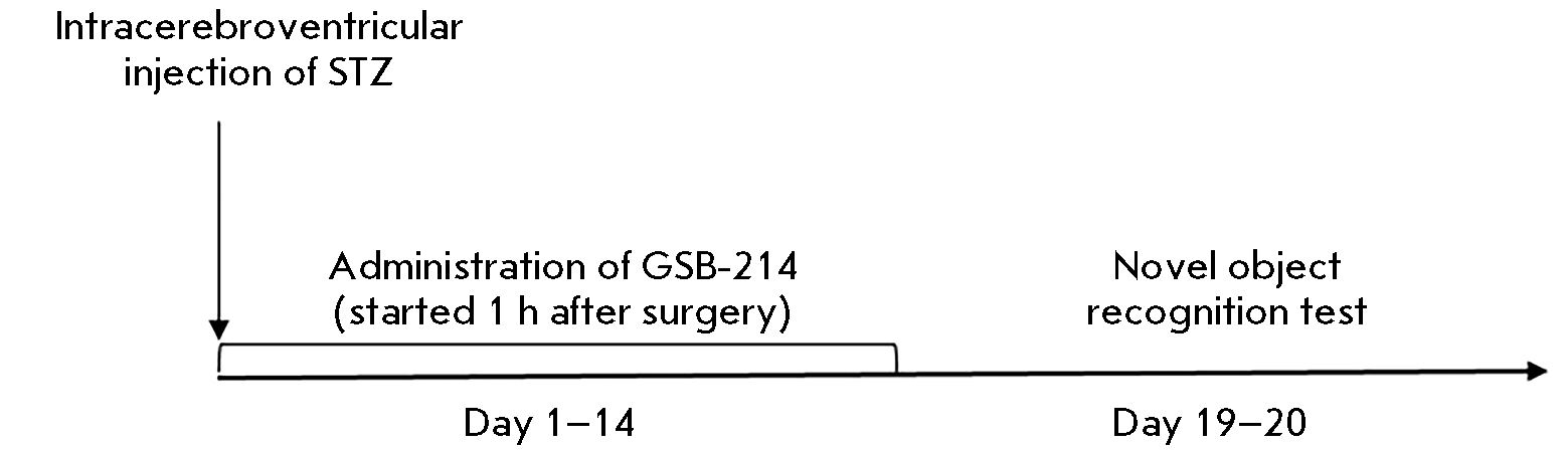 Fig. 3. The scheme of the experiment on the mnemotropic effects of GSB-214 in the streptozotocin-induced AD model. STZ – Streptozotocin