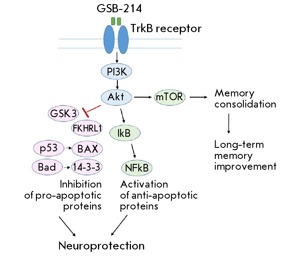 Activation of the PI3K/AKT signaling pathway by the dipeptide GSB-214, which had previously been identified in in vitro experiments [10], may promote neuroprotection by inhibiting pro-apoptotic proteins and activating anti-apoptotic proteins, as well as improve memory consolidation and, therefore, long-term memory through the activation of the regulator of mTOR protein synthesis.