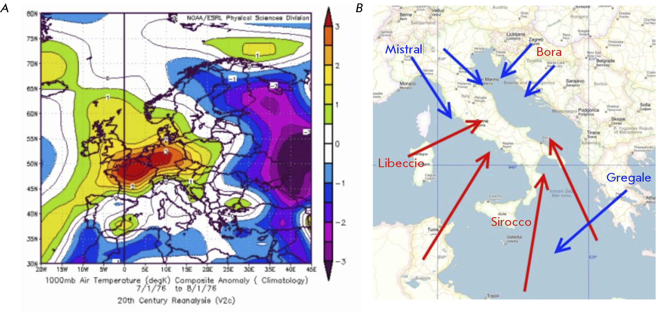 Fig. 1. (A) Typical weather conditions in Northern Italy, around the Alps https://progettoscienze.com/2016/09/29/i-grandi-classici-della-scienza-libellus-de-ratiociniis-in-ludo-alee/#jp-carousel-6901 (B) Typical structure of winds in Italy http://sailroad.ru/article/lociya-srednej-dalmacii-chast-2