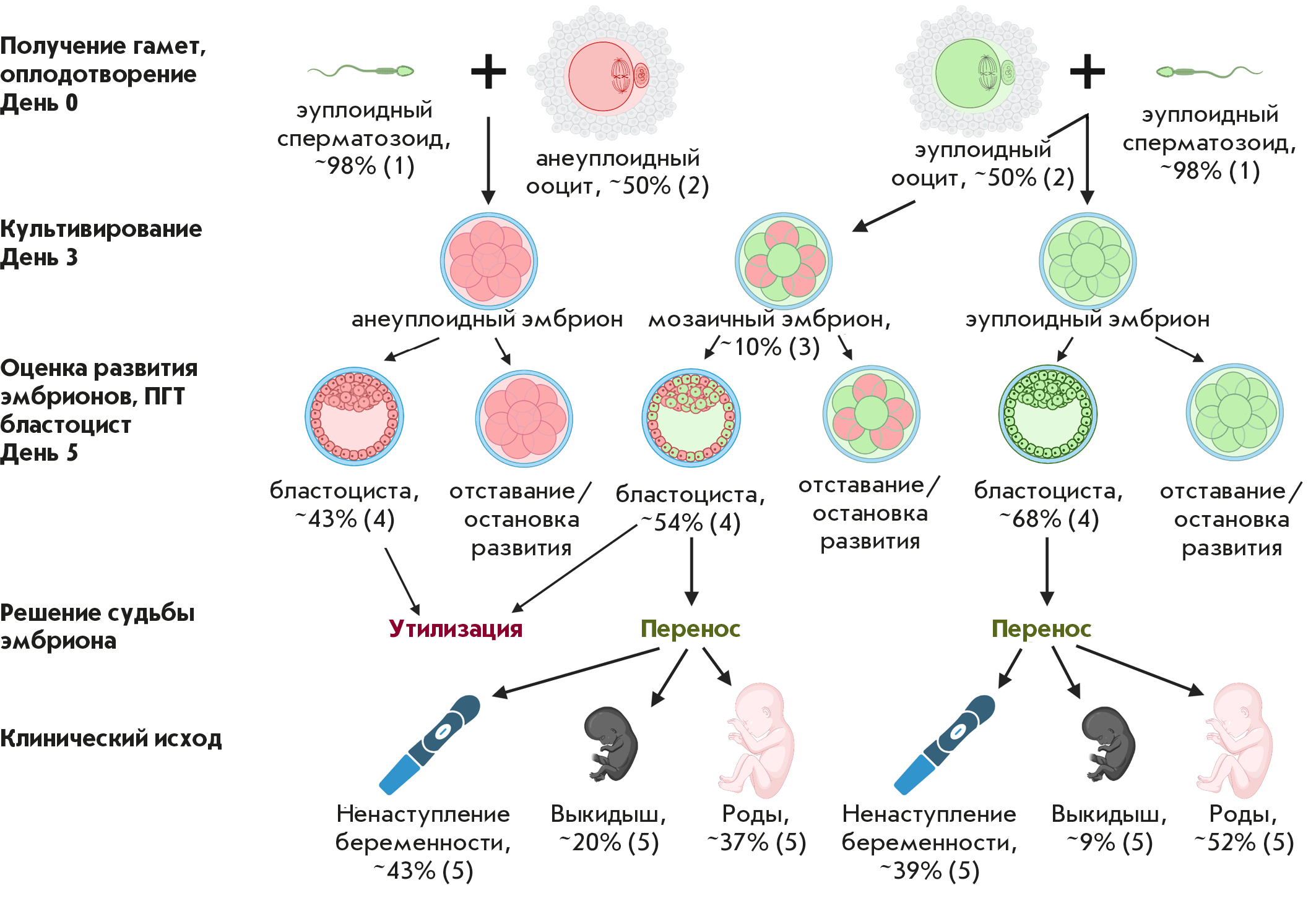 Fig. 1. Efficiency of IVF cycles, depending on the chromosomal status of gametes and embryos. Euploid cells are indicated in green, aneuploid cells are indicated in pink. 1) According to literature data, human spermatozoa in the vast majority of cases do not carry chromosomal abnormalities [23, 24]. 2) Mean rate of chromosomal abnormalities in human oocytes. The proportion of aneuploid oocytes varies from 20% to 80–90%, depending on maternal age (see [80]). 3) Mean rate of embryo mosaicism, based on experimental data [10, 15, 16]. 4) Blastocyst rate in embryos with different chromosomal statuses, according to experimental data [81]. 5) Clinical outcomes after transfer of euploid and mosaic embryos, according to experimental data [19]