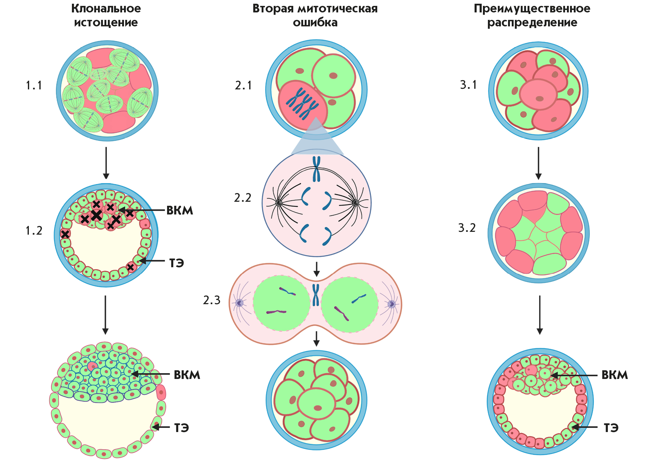 Fig. 2. Models of self-correction of the chromosomal status in mosaic embryos. Euploid cells are indicated in green, aneuploid cells are indicated in pink. Spindles (1.1) reflect an increase in the proliferative activity of euploid cell lines in mosaic embryos. Black crosses indicate apoptotic processes in aneuploid cells (1.2). А trisomal aneuploid embryonic cell (2.1) can undergo corrective mitotic division. One of the chromosomes remains at the mitotic spindle equator due to merotelic attachment of microtubules to kinetochores (2.2) and is not further included in the nuclei of daughter cells (2.3). (3.1, 3.2) Displacement of aneuploid cells to the embryo periphery, to the area of the nascent trophectoderm