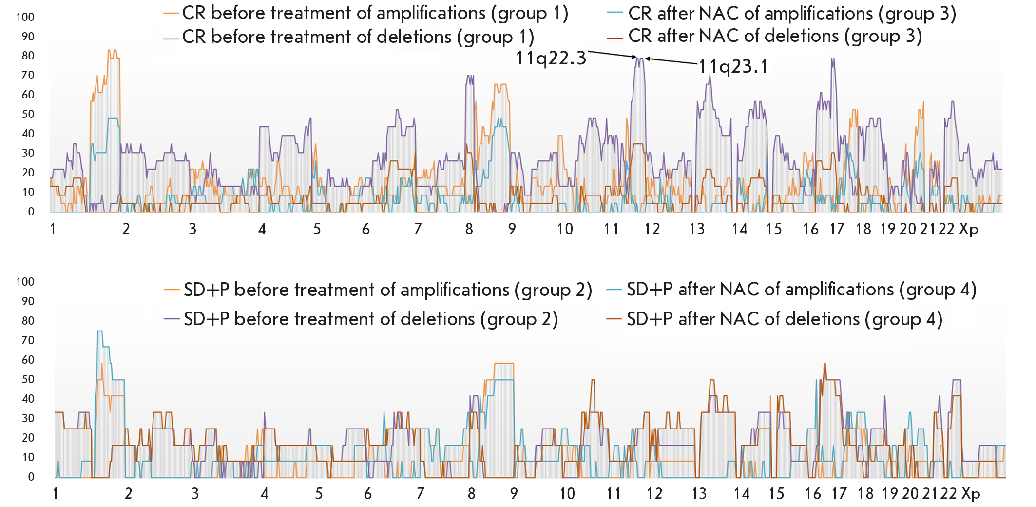 Fig. 2. CNA frequency in breast cancer patients receiving anthracycline-based regimens before and after treatment as part of preoperative chemotherapy depending on the NAC effect. For group 1 and 3 patients with objective response to NAC (partial cancer regression), the CNA frequency before and after NAC is presented as amplification/deletion 1 and amplification/deletion 3, respectively. For group 2 and 4 patients with an absence of an objective response to NAC (cancer stabilization/progression, SD+P), the CNA frequency before and after NAC is presented as amplification/deletion 2 and amplification/deletion 4, respectively