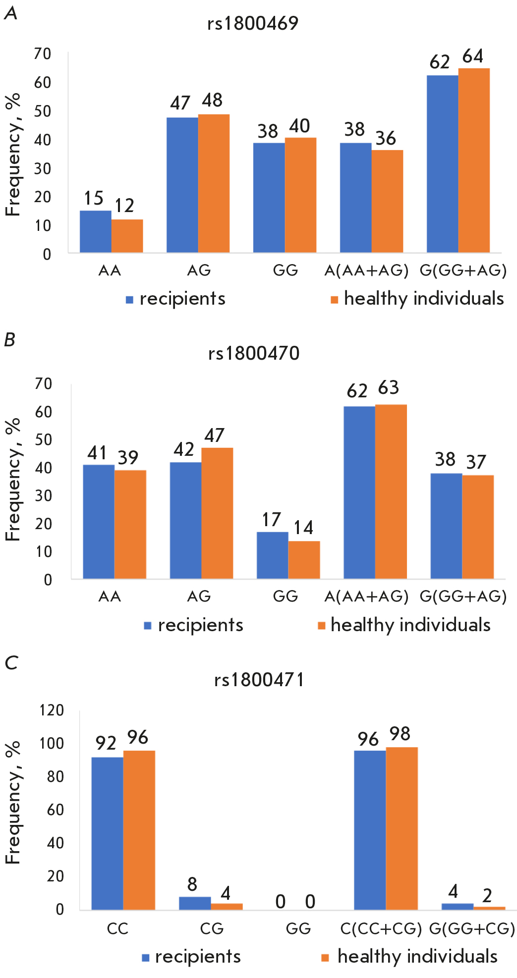 The frequencies of SNPs rs1800469, rs1800470, and rs1800471 in healthy individuals identified in our study are consistent with the data of other domestic authors [17, 18]. A comparison of the distribution of the allele frequencies studied in our work with the data deposited into the U.S. National Center for Biotechnology Information (NCBI) also did not reveal significant differences from that of Tgfb1 in the European population: rs1800469 – A(37%)/G(63%); rs1800470 – A(56%)/G(44%); and rs1800471 – C(94%)/G(6%).