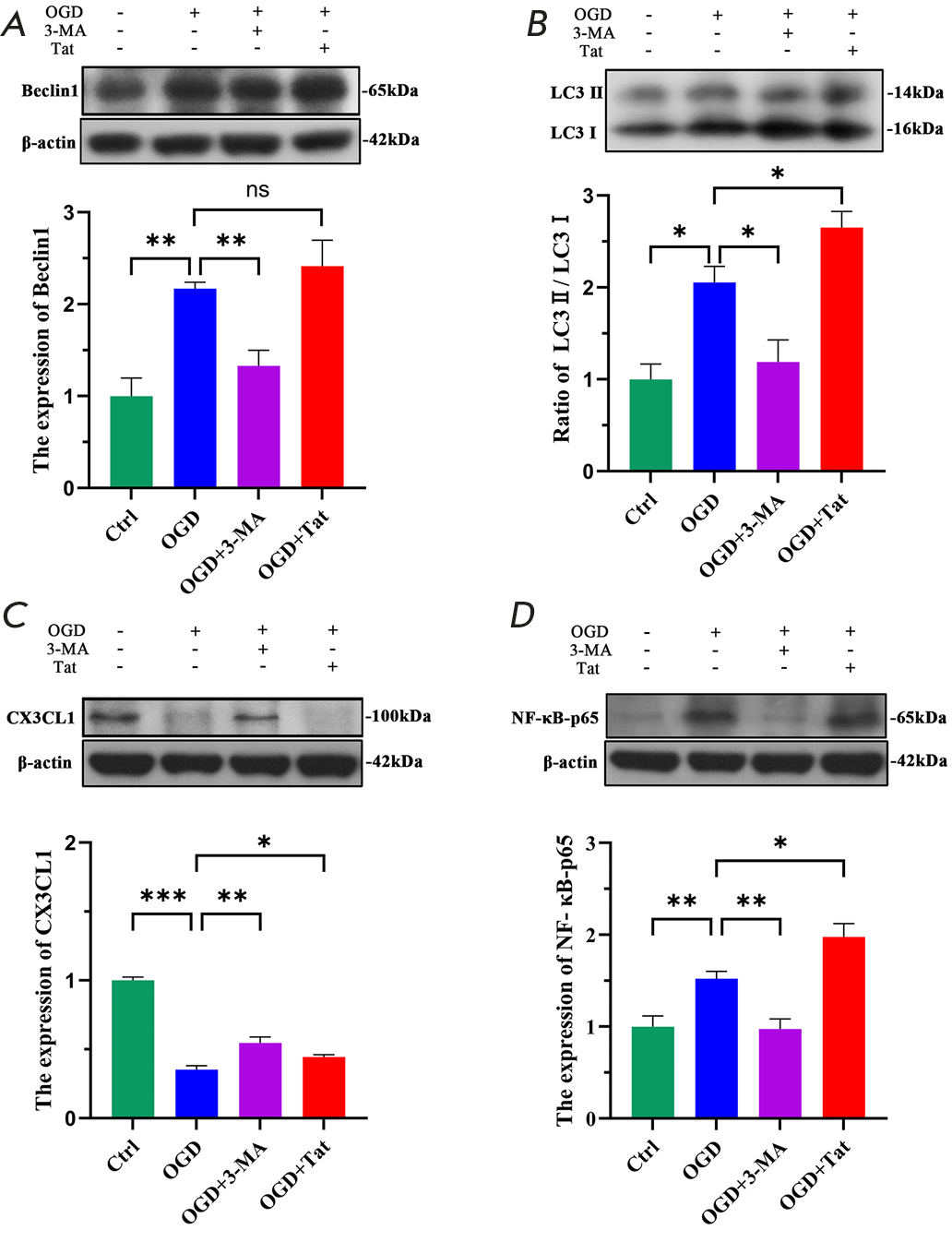 The OGD-elevated autophagy in HT22 cells resulted in decreased CX3CL1 expression, which likely weakened the efficacy of their suppressive action on the microglial inflammatory response, due to a disruption of the CX3CL1–CX3CR1 cross-talk. We, therefore, inquired whether the BV2-mediated inflammation could be abated by increasing the CX3CL1 expression via the attenuation of autophagy in HT22 cells. To alter the autophagy level, the autophagy inducer Tat-Beclin1 and its inhibitor 3-MA, respectively, were added into the co-culture medium upon OGD. Western blot showed that both the Beclin1 expression and the ratio LC3-II/LC3-I could be effectively altered by the autophagic agents (Fig. 3A,B). The promoted autophagy further decreased CX3CL1 expression in the OGD+Tat group, compared with that in the OGD group (Fig. 3C). By contrast, decreasing autophagy increased the CX3CL1 expression in our example (Fig. 3C). Meanwhile, western blot demonstrated that 15 μM of Tat-Beclin1 greatly boosts autophagy in HT22 neurons (Fig. 3A,B). Moreover, Tat-Beclin1-promoted HT22 autophagy markedly reduced its CX3CL1 expression (Fig. 4C). Conversely, 3-MA-inhibited autophagy greatly increased its CX3CL1 expression in the OGD+3-MA group (Fig. 3C), compared with that in the OGD group. We further investigated the effect of the altered CX3CL1 expression in the HT22 neurons on microglial inflammatory signaling. The result indicates (Fig. 4A–D) that the inflammatory signaling of NF-κB-p65 was prominently reinforced by the autophagy-decreased CX3CL1 (Fig. 4C,D). Contrarily, the increased CX3CL1 expression through autophagy inhibition proved effective in mitigating the microglial activation.