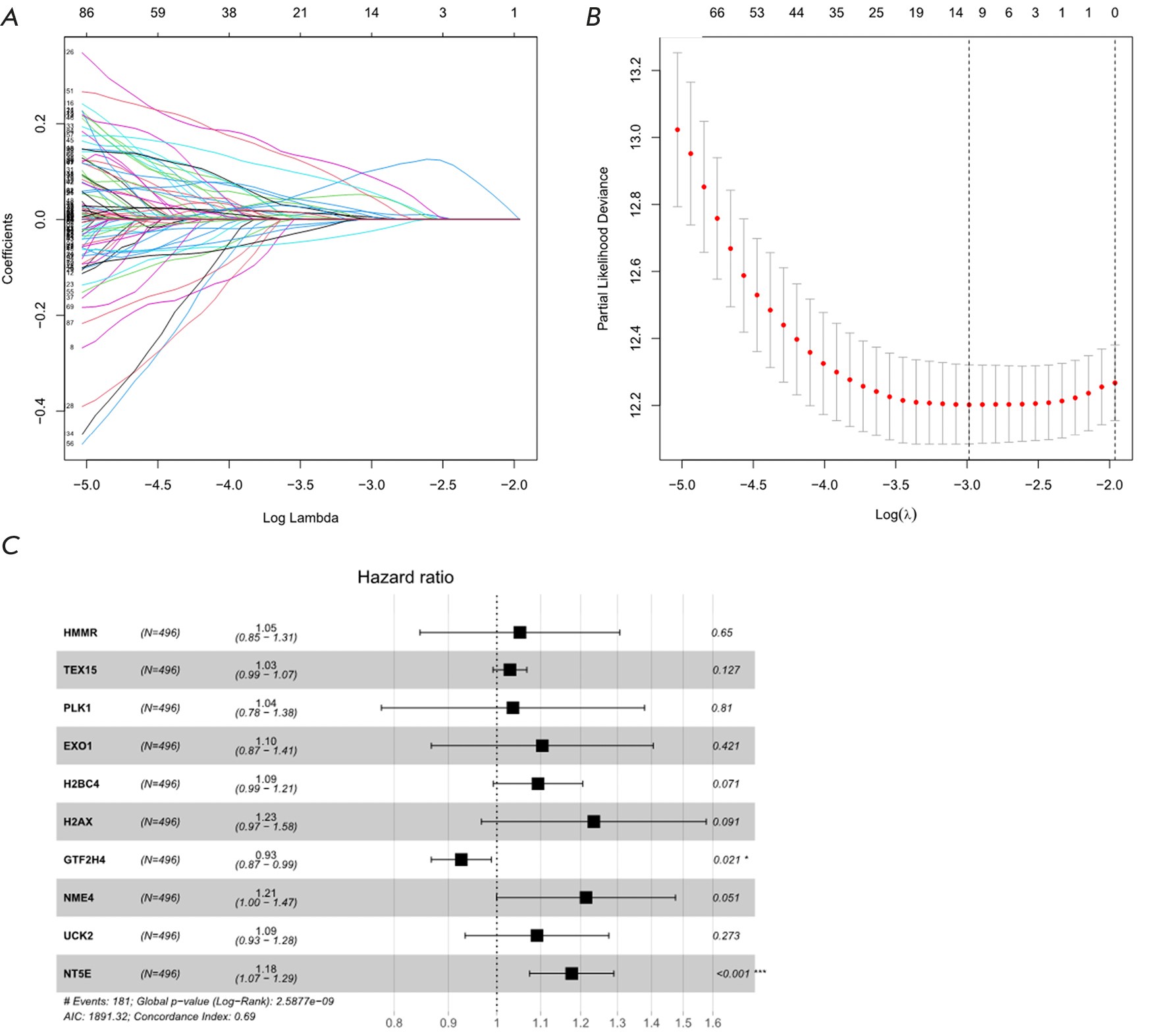 Fig. 2. Construction of a LUAD prognostic model using DRSDs. (A) Cross-validation plot of the logarithmic (λ) sequence in the LASSO model, with the selection of the best parameter (lambda) indicated by the first black dotted line. (B) LASSO coefficient spectrum of 10 OS-related genes. (C) Forest plot of the multivariate Cox regression analysis based on the 10 feature genes in DRSDs