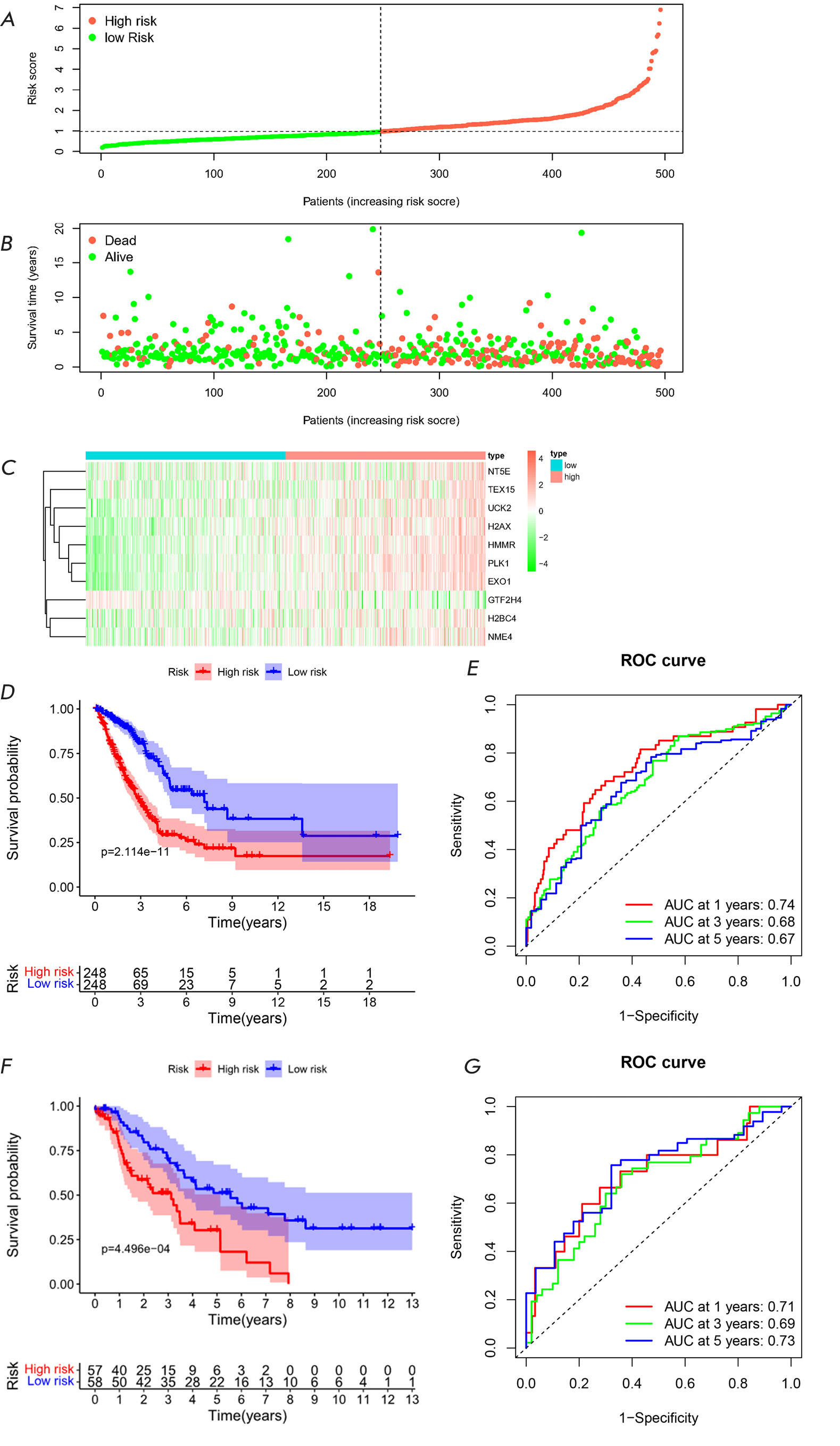 The Riskscore of LUAD samples in both the training and validation sets were computed by utilizing the LUAD prognostic risk model, and specimens were divided into HR and LR groups accordingly. The distribution of Riskscore values and survival status within the training set revealed that patients in the HR group exhibited a higher mortality rate (Fig. 3A,B). The heatmap of feature gene expression in the training set samples showed that all genes except GTF2H4 were highly expressed in the HR group (Fig. 3C). From the training set, we found that the survival rate of HR patients was lower (P < 0.05), indicating better overall prognosis for LR individuals (Fig. 3D). The ROC curve of the training set showed that the AUC values for 1-, 3-, and 5-year were between 0.67 and 0.74, indicating good sensitivity and specificity of the risk model (Fig. 3E). External validation of the validation set showed that patients in the HR group had a lower survival rate than those in the LR group (P < 0.05) (Fig. 3F). The ROC curve of the validation set showed the AUC values for 1-, 3-, and 5-year were between 0.69 and 0.73, proving that the risk model also did well in the validation set (Fig. 3G). In summary, the LUAD prognostic model based on DRSDs exhibits high accuracy and reliability in predicting patient likelihood of survival.