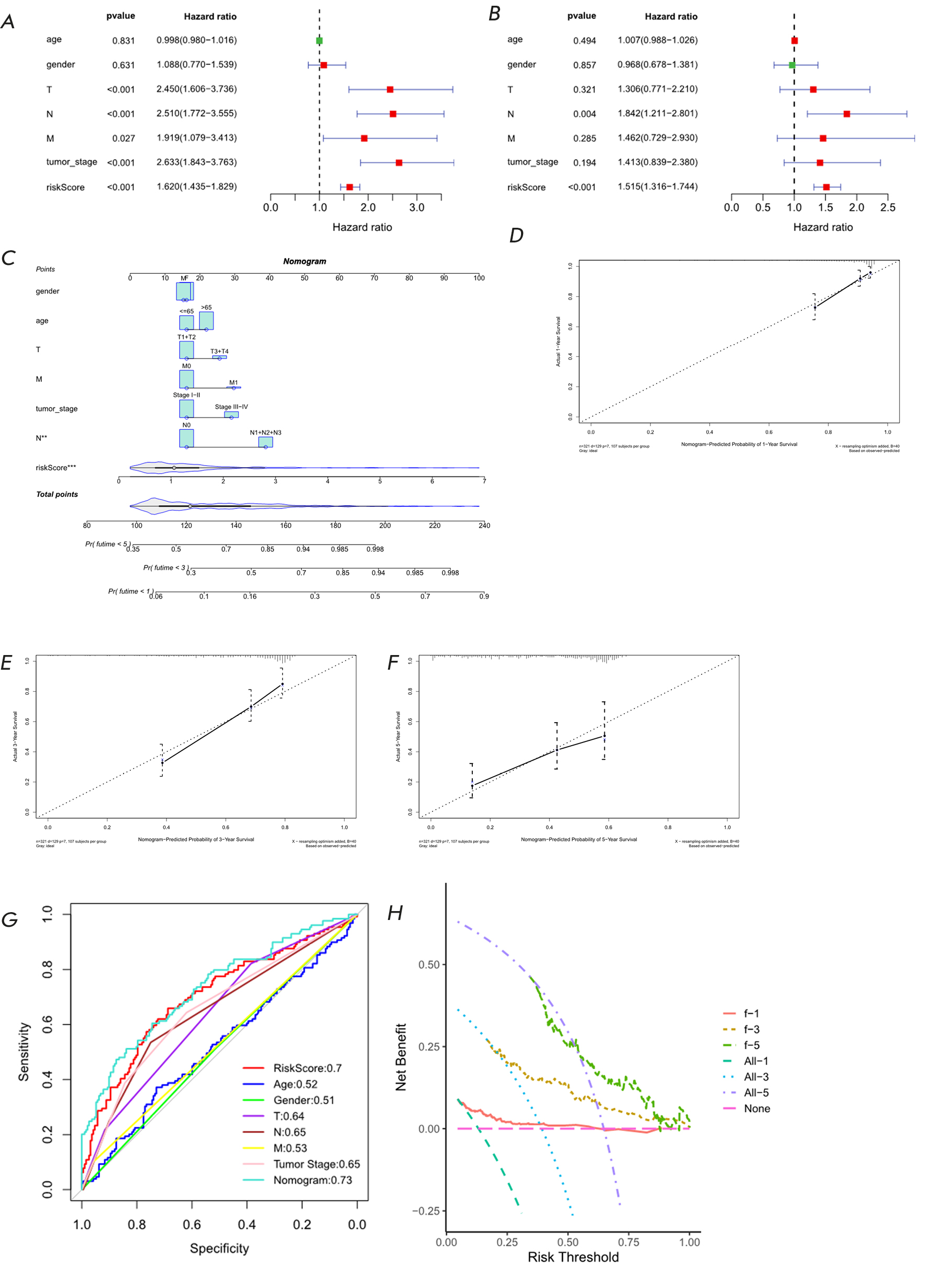 Fig. 4. Independent prognosis analysis of Riskscore in LUAD patients in the TCGA training set. (A) Forest plot of the univariate Cox regression analysis combining Riskscore with clinical information. (B) Forest plot of the multivariate Cox regression analysis combining Riskscore and clinical information on LUAD patients. (C) Nomogram constructed by combining Riskscore and clinical information. (D), (E), and (F) Calibration curves for predicting the risk of 1-, 3-, and 5-year death, respectively. (G) Clinical features, Riskscore, and ROC curve used to diagnose Nomograms. (H) DCA curve for diagnosing Nomograms