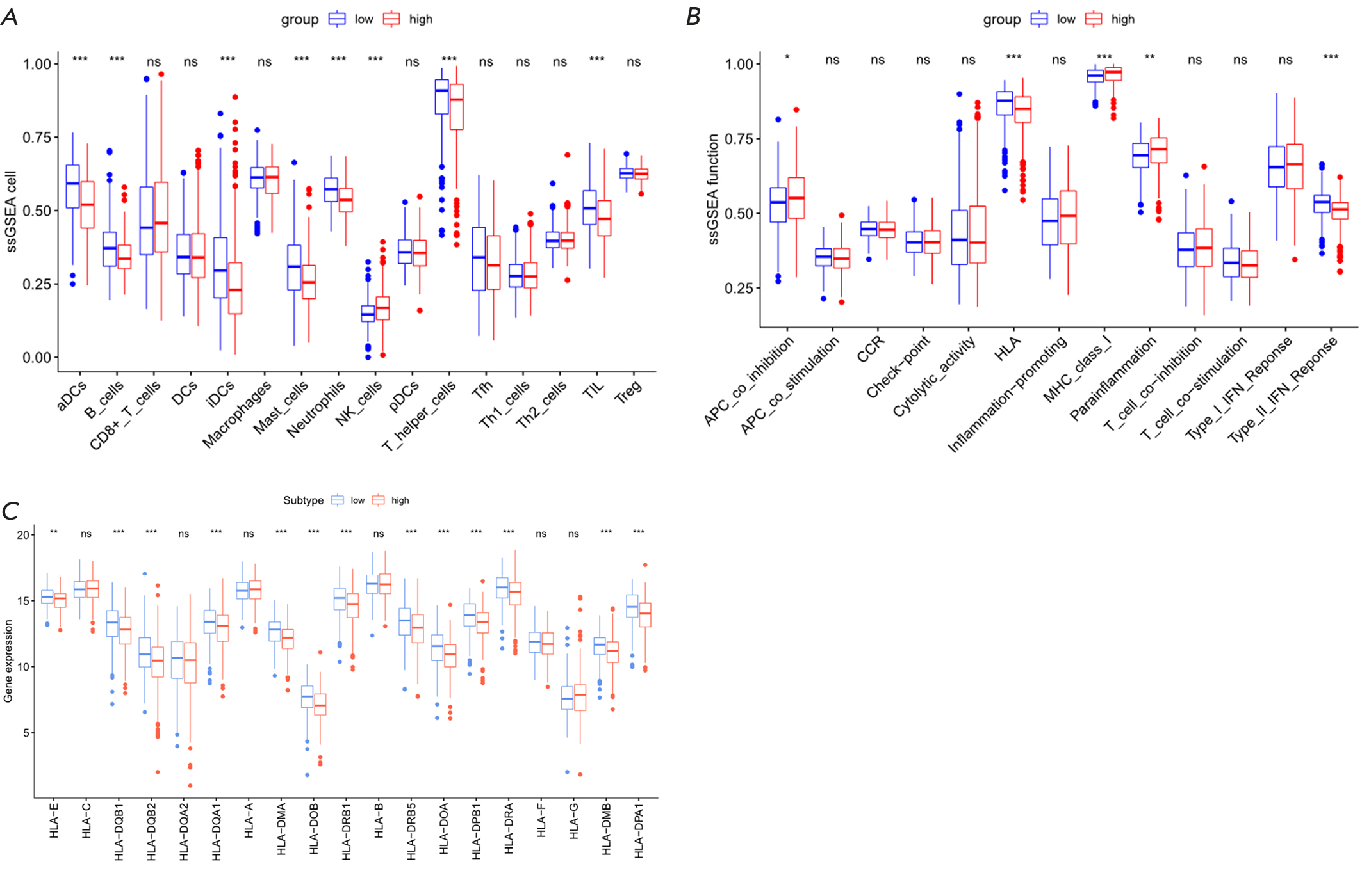 Fig. 5. Analysis of immune cell infiltration and immune function between the high-risk and LR groups of LUAD patients using ssGSEA. (A) Analysis of immune cell infiltration. (B) Analysis of immune function. (C) Expression level analysis of HLA genes