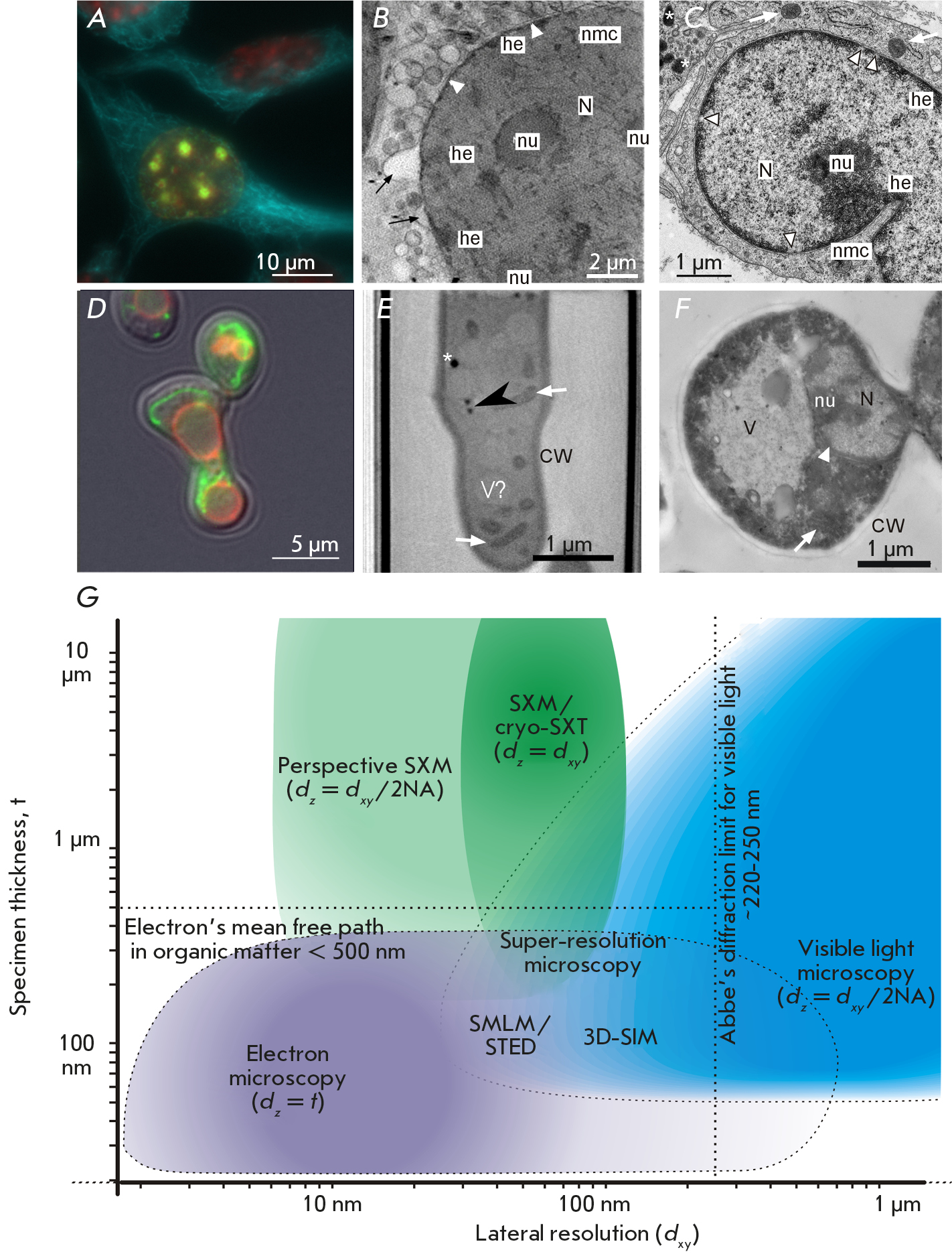 (A) – fluorescent micrograph of whole chemically fixed mouse cells in vitro: blue – microtubules, fluorescent anti-α-tubulin antibodies; green – newly replicated DNA, click-reaction with ethynyl-deoxyuridine; red – nuclei, DNA-binding fluorescent dye DAPI. (B) – tomographic slice of cryofixied cell by cryo-SXT: N – nucleus, nu – nucleoli; he – heterochromatin, nmc – nuclear membrane channel, arrowheads – nuclear envelope, black arrows – outer nuclear membrane blebs (adapted with modifications from [11] CC 4.0 BY). (C) – EM micrograph of aldehyde-fixed heavy metal-stained cell: mouse connective tissue, ultrathin section: white arrow – mitochondria; * – lipid droplets. (D–F) – yeasts S. cerevisiae. (D) – fluorescent micrograph of a whole cell (zygote): green – mitochondria, chimeric mitochondrial protein Idh1-GFP; red – vacuolar membrane, FM4-64 fluorescent dye; cell outline – differential interference contrast (photo kindly provided by Knorre D.A.). (E) – tomographic slice of cryofixied cell by cryo-SXT: V – vacuole, CW – cell wall; black arrowhead – structure used for correlation of images, possibly – small lipid droplet, (adapted with modifications from [15] CC0 1.0). (F) – EM micrograph of aldehyde-fixed heavy metal-stained cell, ultrathin section. (G) – Soft X-ray, visible light and electron microscopy positions in a “resolution space.” Color intensity represents the scale in which each method is mostly demanded in the studies of the cellular structure and functions. NA – numeric aperture, the light-gathering capacity of the microscopes’ lens which, in combination with the wavelength (λ), is the determinant of the critical resolution: dxy = 0,61 × λ/NA [4]. Photos A, C, F were taken by the authors of the review
