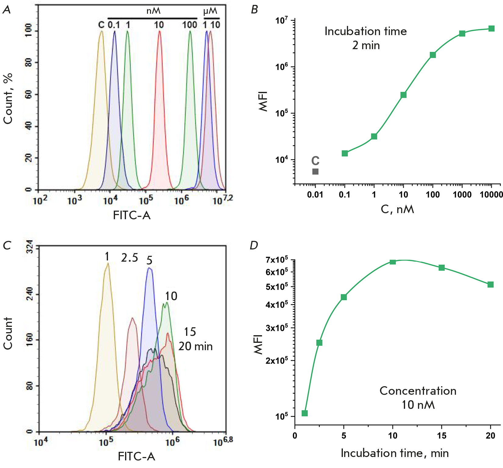 Fig. 2. Cytometric analysis of HeLa cells exposed to the BDP-C7 dye for 2 min at concentrations ranging from 0.1 nM to 10 μM (A, B) and at 10 nM for 1–20 min (C, D). C – control cells not subjected to dye treatment. The histograms of the intensities in the green fluorescence channel with excitation at 488 nm and emission detection at 530/30 nm (A, C) and the median fluorescence intensity (MFI) values of the cell populations (B, D) are shown