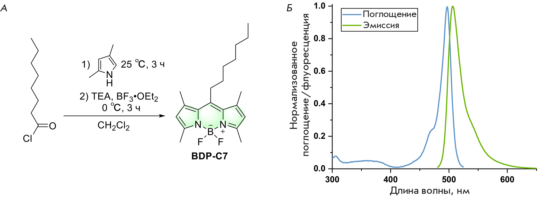Fig. 1. Synthesis of the BDP-C7 dye (A) and its absorption and fluorescence emission spectra in DMSO (B)