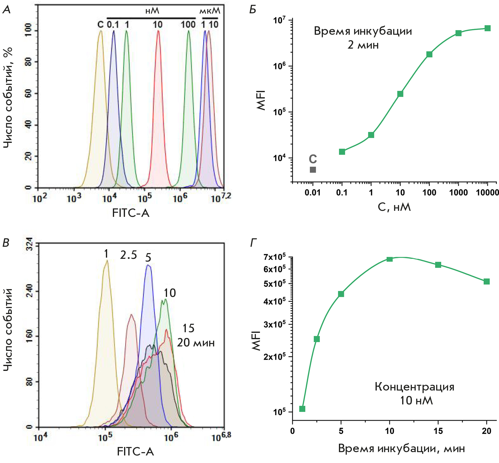 Fig. 2. Cytometric analysis of HeLa cells exposed to the BDP-C7 dye for 2 min at concentrations ranging from 0.1 nM to 10 μM (A, B) and at 10 nM for 1–20 min (C, D). C – control cells not subjected to dye treatment. The histograms of the intensities in the green fluorescence channel with excitation at 488 nm and emission detection at 530/30 nm (A, C) and the median fluorescence intensity (MFI) values of the cell populations (B, D) are shown