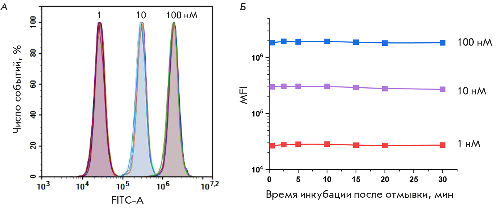 Fig. 3. Analysis of the BDP-C7 dye washout from the cells. Cytometric analysis of HeLa cells exposed to the dye for 2 min at concentrations of 1, 10 and 100 nM. Cells after washing to remove the unbound dye and incubation in PBS buffer for a given time. Histograms of the intensities in the green fluorescence channel (A) and the median fluorescence intensity (MFI) of the cell population (B) at different incubation times after washing are shown